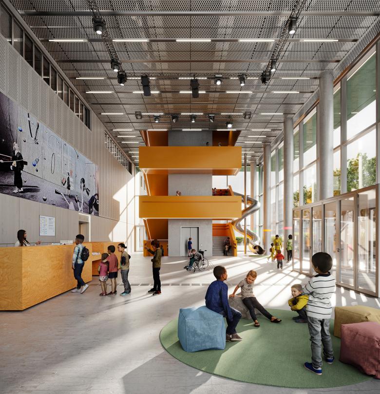 The planned LED wall inside the foyer can project a variety of interactive installations specially designed for children and adolescents. This virtual art will be transmitted into the public space through the floor-to-ceiling windows.