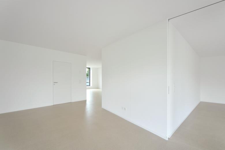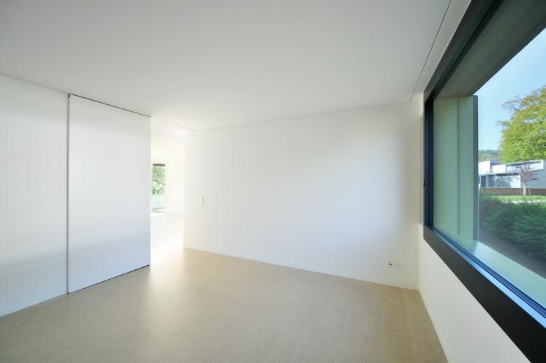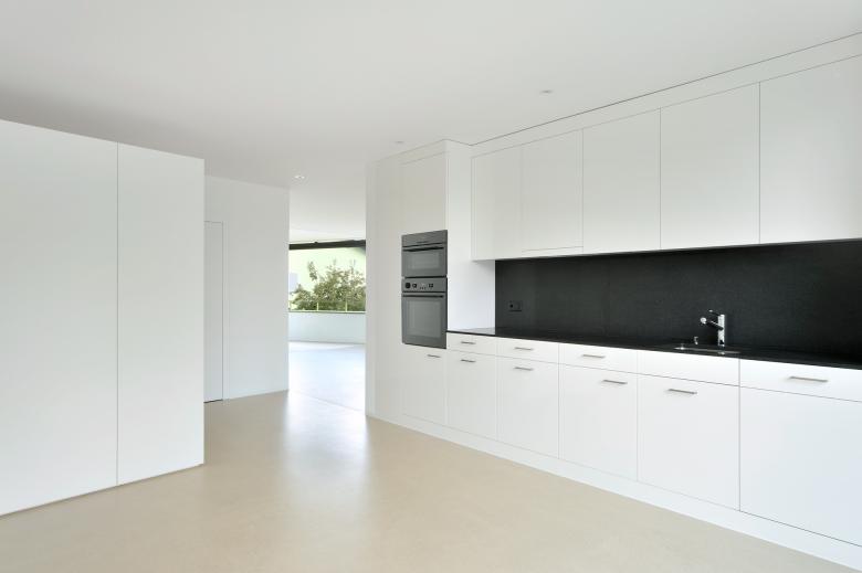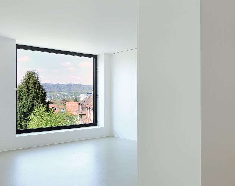 Das Polygonale zieht sich bis in die Wohnungsgrundrisse, mit der die Baugenossenschaft Halde im Bezug auf Wohnform und Gestaltung neue Wege beschreitet. Mäandriert formt sich weiträumig der Bereich Küche/Essen zum Wohnen hin, ohne eigentliche Verkehrsflächen wirken die Wohnungen mit den riesigen Fensteröffnungen lichtdurchflutet und grosszügig. Aufwendige Fensterlösungen ergeben von aussen den Bezug zur best. Umgebung und auf der Innenseite eine fantastische Optik kombiniert mit praktischem Nutzen.
