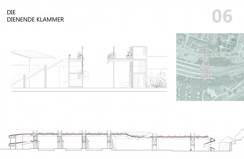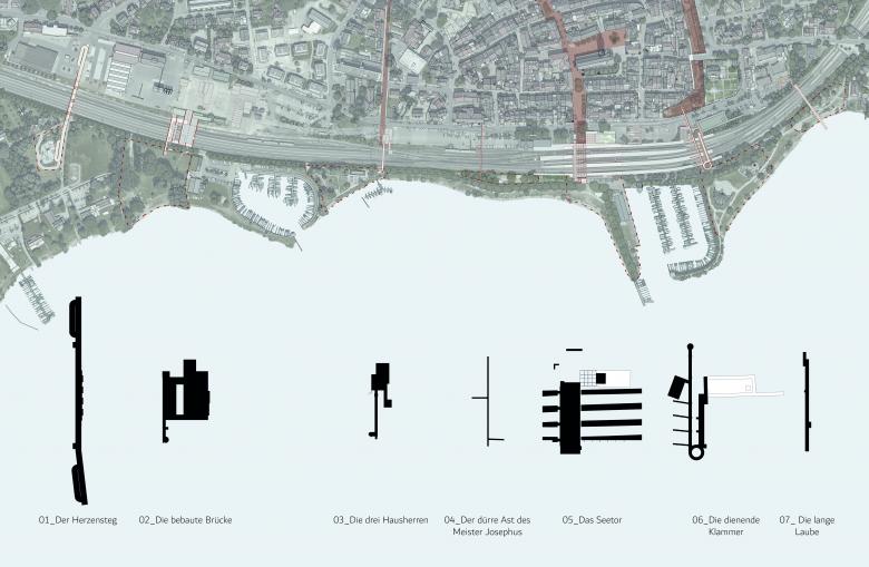 In different scales the project reshapes the area around the train station in Radolfzell as a new link between the city and the lake. Seven context related bridges implementing interconnectedness, a quality of public space and the potential for appropriation and identification to the suburban space.