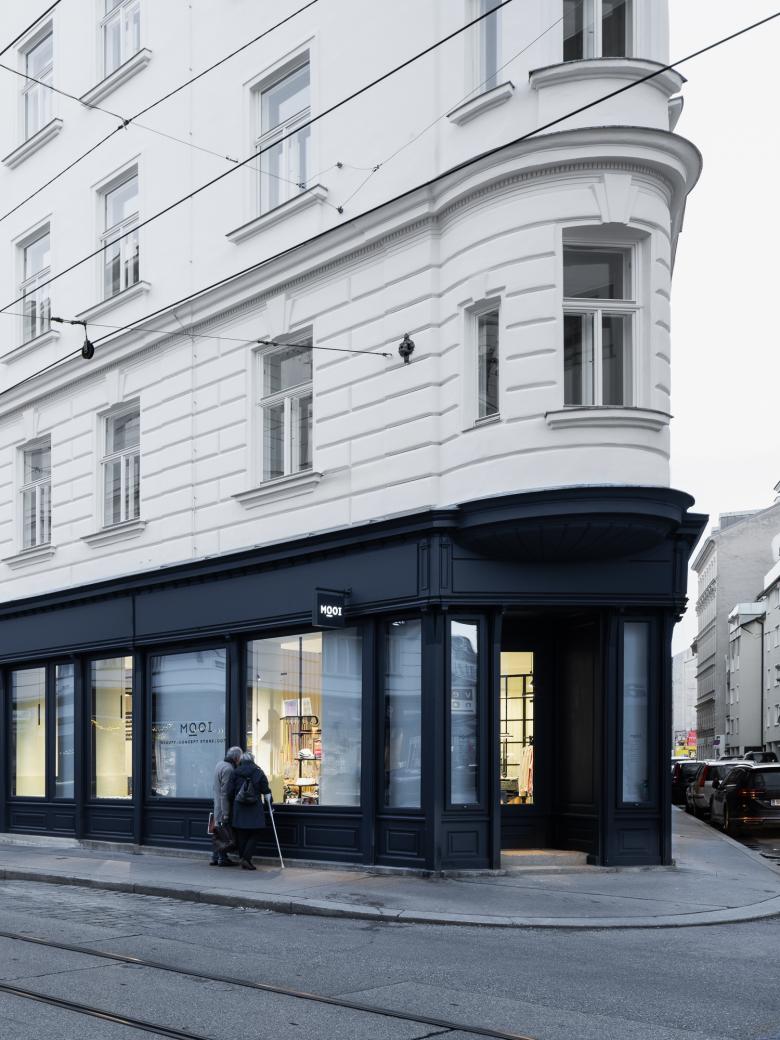 MOOI in der Wiener Josefstädterstraße beeindruckt als 'Beauty & Concept Store' mit klarem, urbanem Design, das beim Betreten sofort spürbar ist. Der Empfangstresen, der sich als Bar weiterzieht, besteht aus schwarzem, gezacktem Terrazzo, gestützt auf Kupferfüßen, und wird von einer Rückwand aus geschwungenen Betonbögen ergänzt. Dieses Zusammenspiel aus Naturmaterialien wie Holz und Stein in zarten Grüntönen schafft eine einladende Wohlfühlatmosphäre. Die Betonbodenbeschichtung und gewellte Wandverkleidung bilden eine ruhige Basis, während die unterschiedlichen Terrazzi und das reflektierende Kupfer dem Raum einen edlen Schliff verleihen.