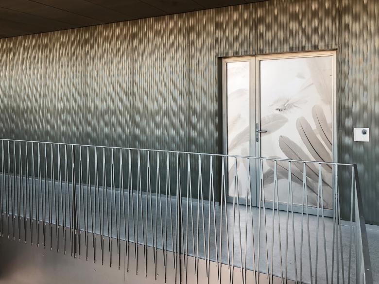 Im Innenausbau und in der Ausstattung wurden bewusst und gezielt wertige und industrielle Materialien kombiniert. Harmonische Erdfarben sowie mineralische Nuancen verschmelzen mit metallischen Beigetönen. Transparenz, Transluzenz und Reflektion sorgen für spannende Lichtspiele und eine überraschende Raumwahrnehmung. Federmuster in unterschiedlichen Varianten und markante Blautöne repräsentieren gemäss bestehendem Corporate Identity die Firma ideal.