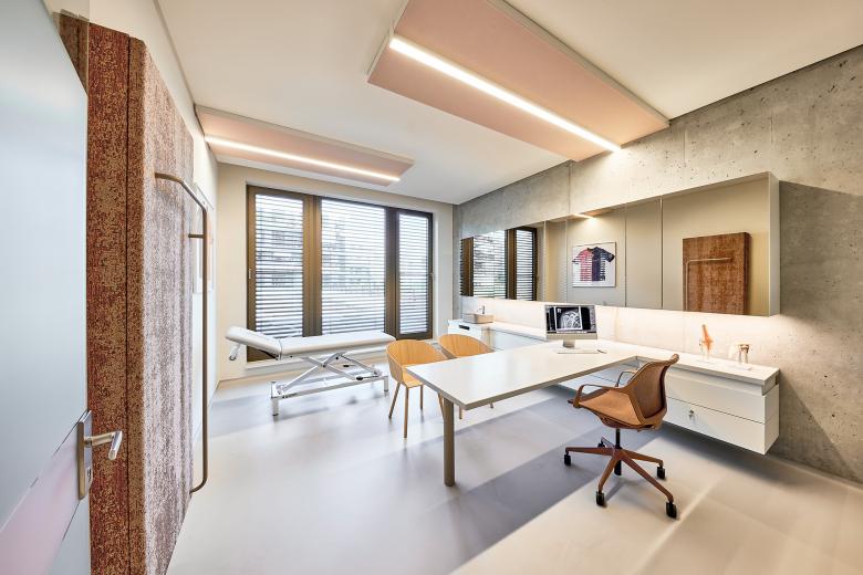 Das Herzstück der 370 m² großen Praxis bildet der zentrale Erschließungskern, an den sich ein offener, großzügiger Empfangsbereich anschließt. Im Kern sind die nutzungsspezifischen Nebenräume wie Diagnostik und Sanitärbereiche verortet. Die Behandlungsräume, Wartezimmer sowie der Aufenthaltsbereich für die Mitarbeitenden befinden sich hingegen entlang der großzügigen Fensterfronten an der Nord- und Südfassade. Zwei lineare Durchgänge verbinden die beiden Zonen und gewährleisten eine klare, intuitive Wegführung.