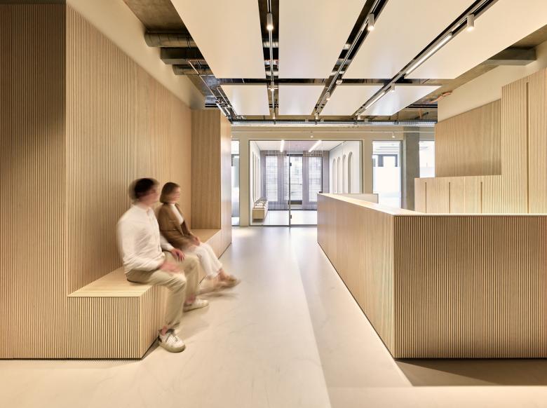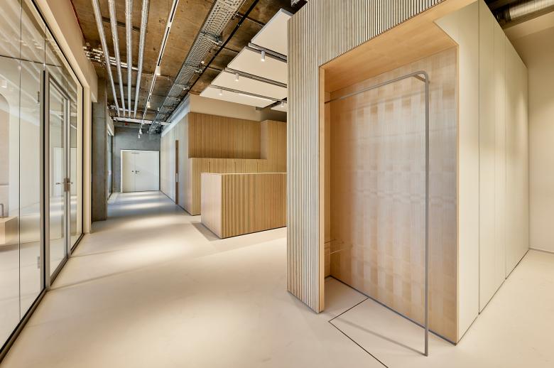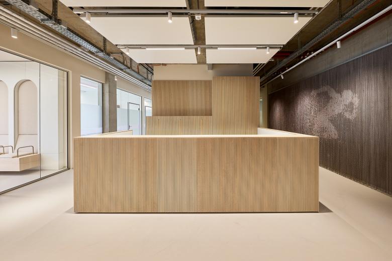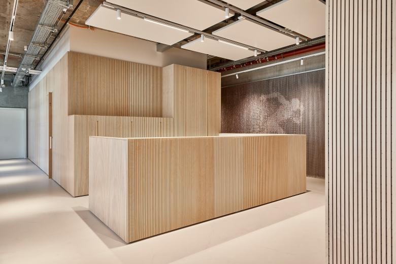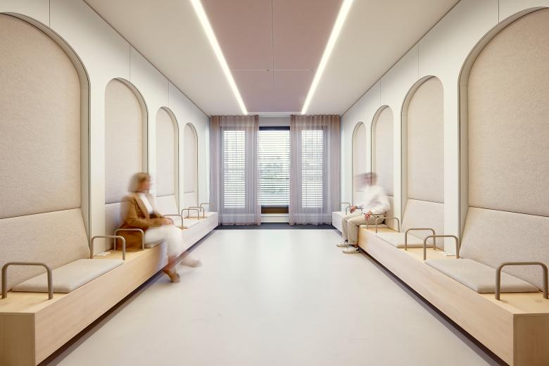 Diese Wegeführung wird durch raumbildende Einbauten und Elemente unterstützt, die aus der linearen Struktur und den schallabsorbierenden Wandverkleidungen aus Birkenholz hervortreten. Ihre skulpturale Formgebung setzt ebenso visuelle Akzente wie die akustisch wirksamen Deckensegel mit integrierten Langfeldleuchten und die maßgefertigten Garderobenschränke. Gleichzeitig sorgen sie für eine angenehme und diskrete Raumakustik in einem vertraulichen Umfeld.