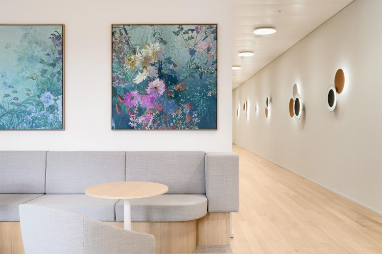 Our goal was to design a space for the Hirslanden Clinic Stephanshorn that gives the patients a feeling of competence, calmness and well-being. The style is characterized by a simple and timeless design, which creates a harmonious and calm atmosphere. We have worked with natural and sustainable materials, soft shapes and subtle contrasts. The fair and gentle colors, the light wood and the high-quality furniture ensure a sense of security. The pictures on the wall are made from wallpaper of the traditional St. Gallen company Jakob Schlaepfer. They underline the clinic's strong connection to the region. The well thought-out lighting concept accentuates the soft character of the rooms.
