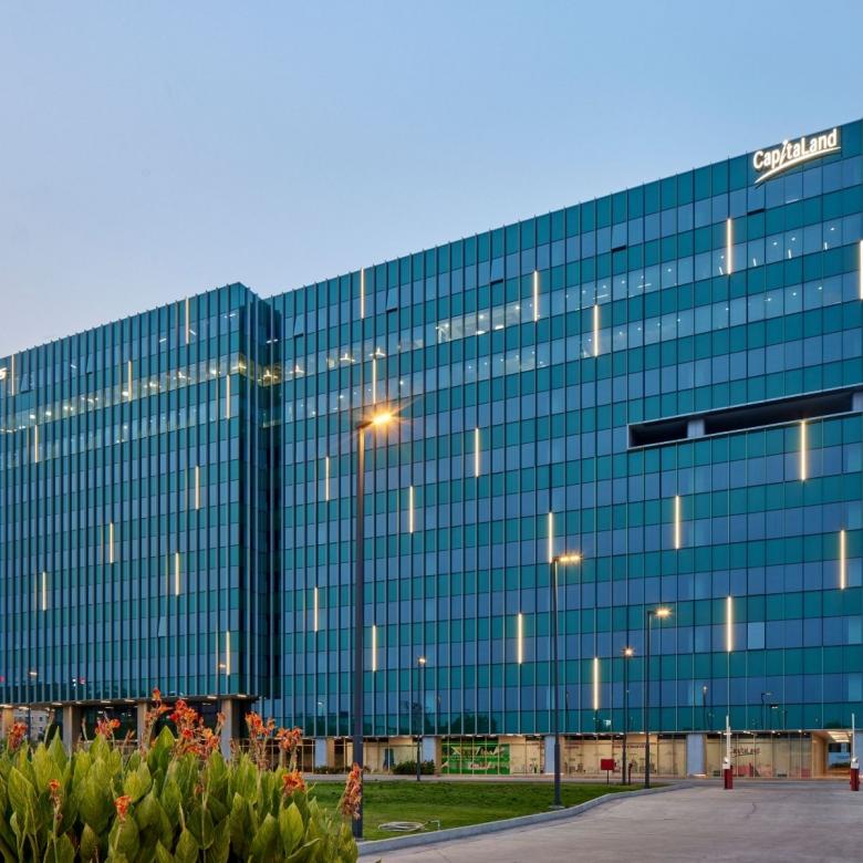 Each tower rises to a height of 45 m, comprising three basement levels for parking, a ground level for retail and food courts, and ten storeys above for office leases, capped by a terrace programmed for wellness activities. A naturally lit central atrium featuring hydroponic vertical gardens enhances indoor air quality and offers visual relief to each level. A high-performance glazed façade wraps the towers in laminated glass fins whose tonal variations echo CapitaLand’s brand palette. Landscaped refuge balconies and projected masses add a dynamic quality to the facade by offsetting the linearity of the tower.