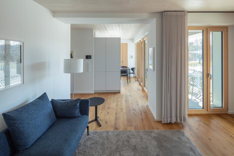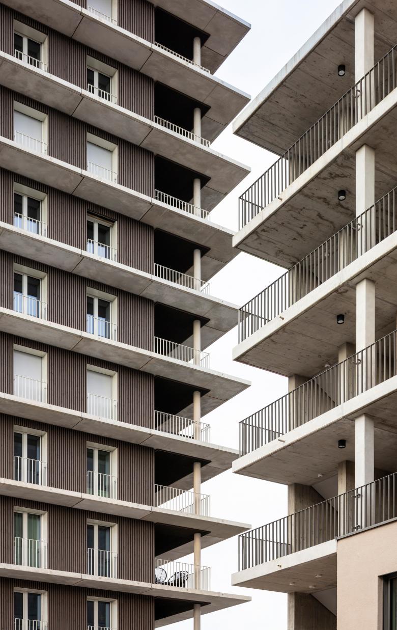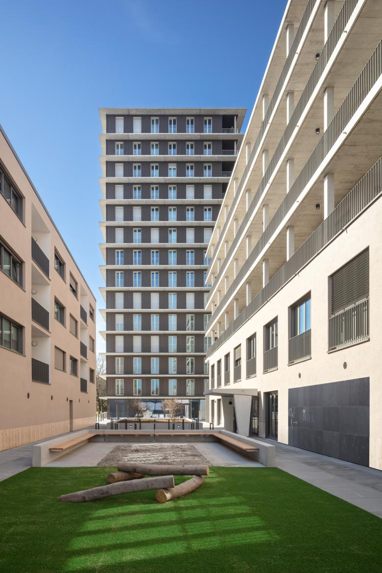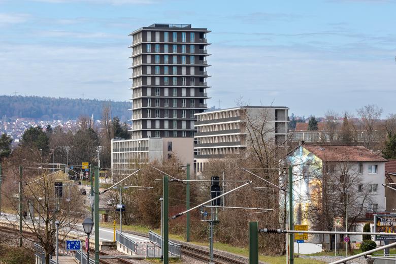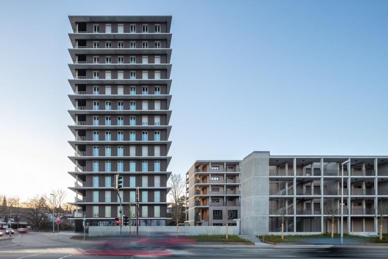 Das Hochhaus mit 14 Geschossen ist aktuell das höchste in Süddeutschland und wurde in Holz-Hybrid-Bauweise errichtet. Die Vollholzfassade mit französischen Fenstern wurde durch die brandschutztechnische Besonderheit einer umlaufenden Krempe ermöglicht. Das Gebäude kommt ohne Sprinkler aus und hat eine natürliche Belüftung. Dieser Low-Tech-Standard hat nicht nur die Baukosten verringert, sondern garantiert Mietnebenkosten weit unter dem Durchschnitt.