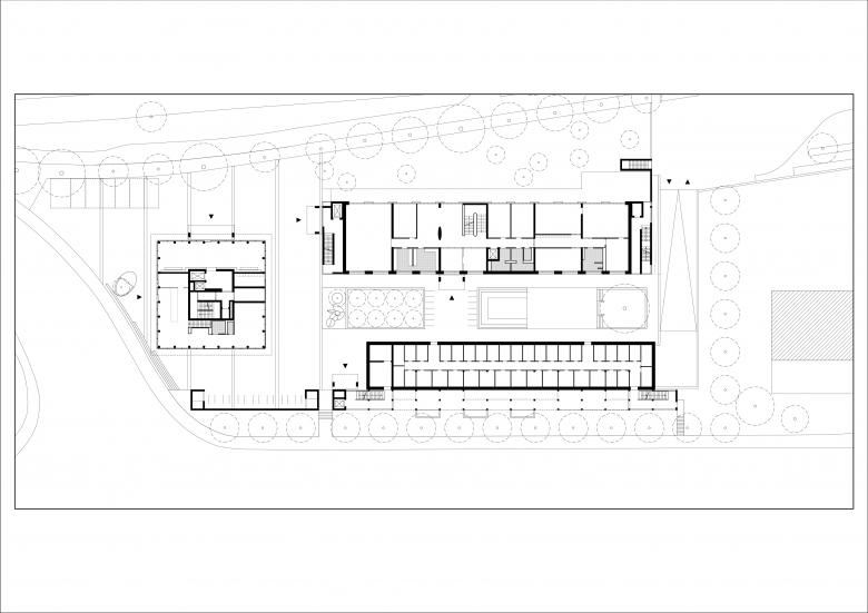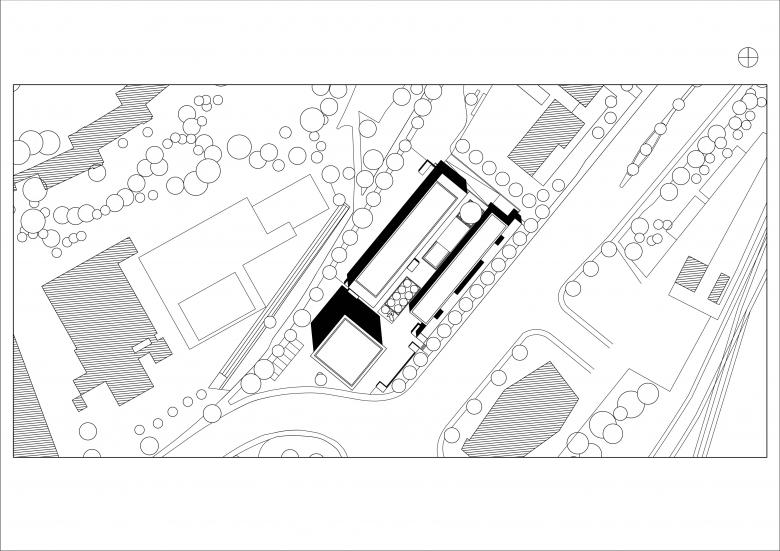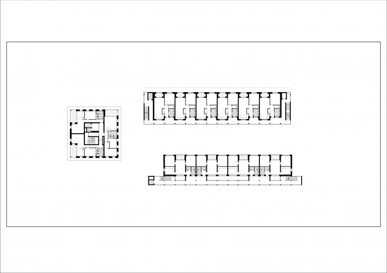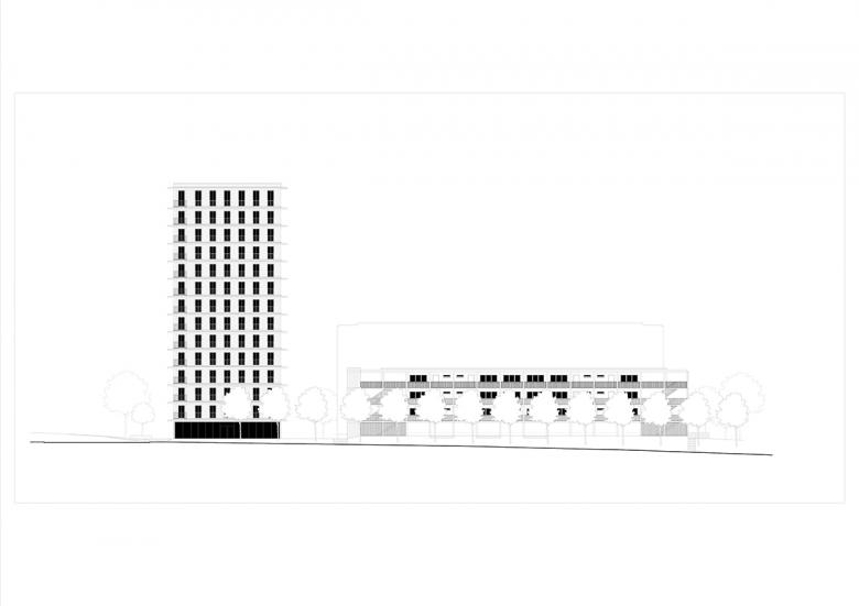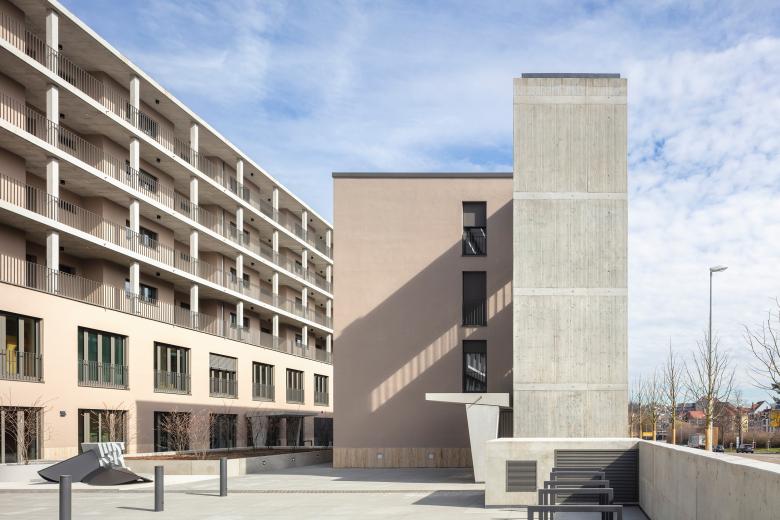 Auf Grund der viel befahrenen Straße wurde die straßenbegleitende Bebauung als Laubenganghaus entworfen. Die Ausführung des Laubengangs als ebenso robuste wie feine Struktur aus Betonfertigteilen ist eine bewusste Reminiszenz an den „poetischen Rationalismus“. Der geschützte Raum zwischen den Baukörpern fungiert als innerstädtische Oase, von deren Mitte das Gebäudeensemble erschlossen wird.