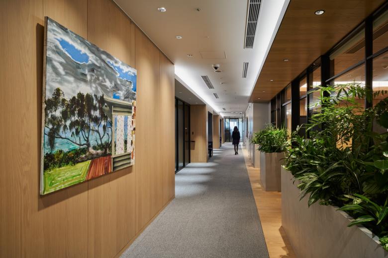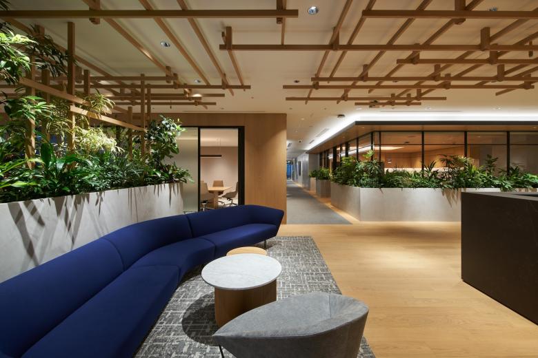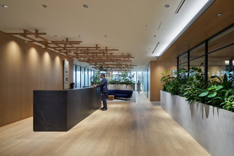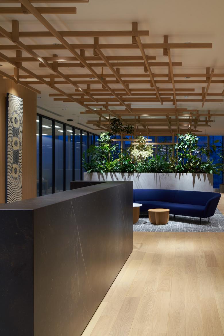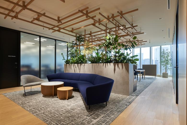 This relocation project, planned for a global financial institution in central Tokyo, sought to integrate the company’s global design concept while introducing a distinct Tokyo identity. To achieve this, the design incorporates natural materials such as wood and mortar, along with Japanese-inspired elements like wooden lattice structures—offering a spatial experience that reflects both the essence of Tokyo and the spirit of Japanese design. In line with the color strategy used in the company’s global offices, seasonal tones were introduced across various zones, bringing a sense of rhythm and visual diversity to the workspace.