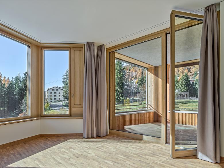 Das Motiv des traditionellen Engadiner Erkers wird aufgenommen und neu interpretiert. Jedes Zimmer verfügt über einen Erker und profitiert so von einer zweiseitig orientierten Aussicht. Die Bewohnerinnen und Bewohner können in die Fensternische sitzen und den Blick über den See, die Alpen oder den belebten Platz schweifen lassen. Aussen bezieht sich die mineralischer Waschputzfassade das Gestein der Alpenumgebung, während innen Oberflächen aus Holz eine warme Atmosphäre schaffen und an traditionelle Innenräume der Region erinnern.