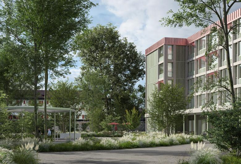 Als raumgreifende Figur fügt sich der Neubau ins Quartier ein und bildet das Gegenüber der Klosteranlage. An seiner Südseite entsteht ein grosszügiger Freiraum, der zur identitätsbildenden Mitte der gesamten Alterssiedlung wird. Die öffentlichen Erdgeschossräume sind als vielfältig bespielbares Raumkontinuum nach unterschiedlichen Seiten zum Garten orientiert. Die Wohngruppen werden geschossweise über gemeinsame Vorhallen erschlossen, denen auch Dienstleistungs- und Verwaltungsräume angegliedert sind. So werden vielfältige Begegnungen zwischen Bewohnenden und Mitarbeitenden ermöglicht.