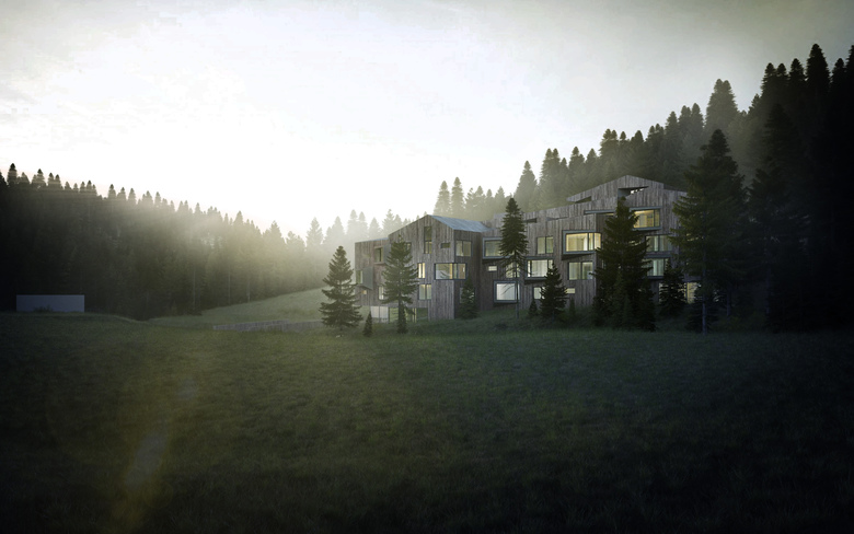 The footprint of the designed apartment house follows the footprint of the original burnt-out building. The building materials that are used are traditional and specific for the site. The cladding of the facade is natural untreated wooden of various widths and heights that were chosen as the buildings character corresponds to the rough honesty of the surrounding landscape. The roof covering will be made of aluminium sheets. To achieve a suitable insolation of residential units, especially those oriented to the north, bay windows have been designed whose glazed areas are facing to the east or the west. These, together with the layout of the ground plan of the building, follow the breakdown of the original recreational cottages of the Giant Mountains (Krkonoše), which are usually decorated with decorative oriels. The total mass of the building follows the sloping terrain and blends in with the surrounding forest.