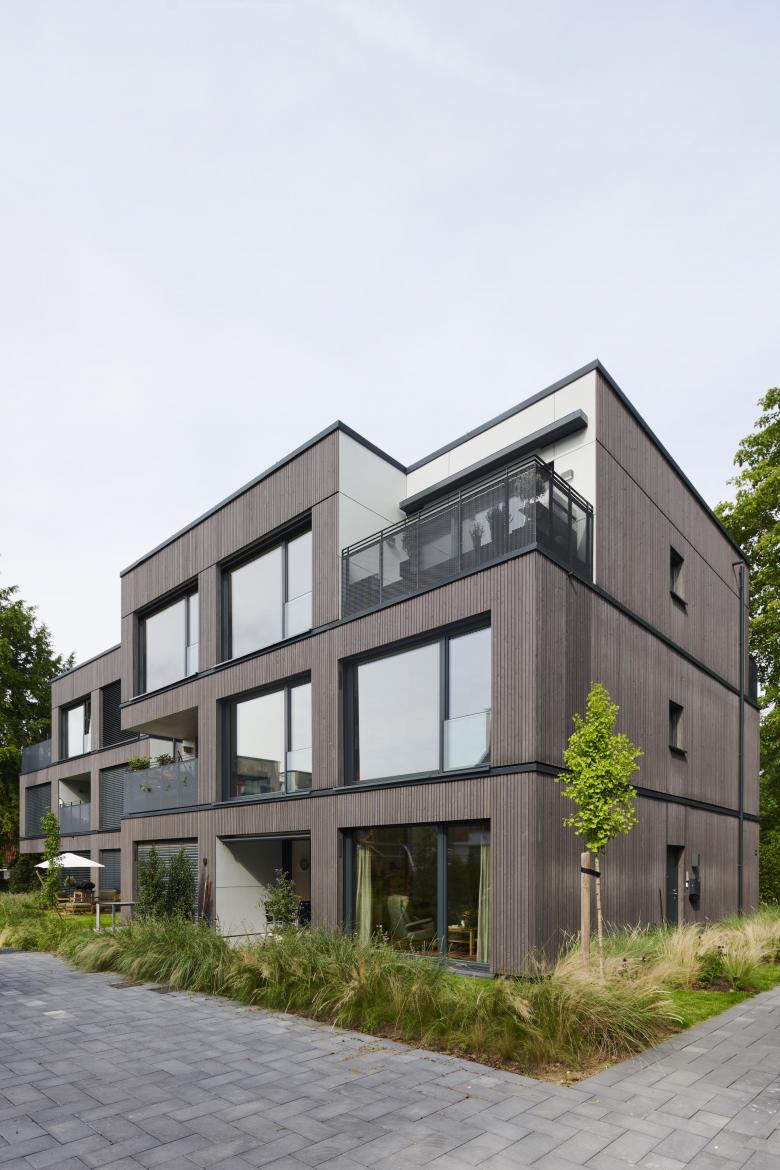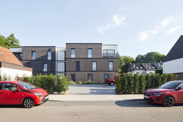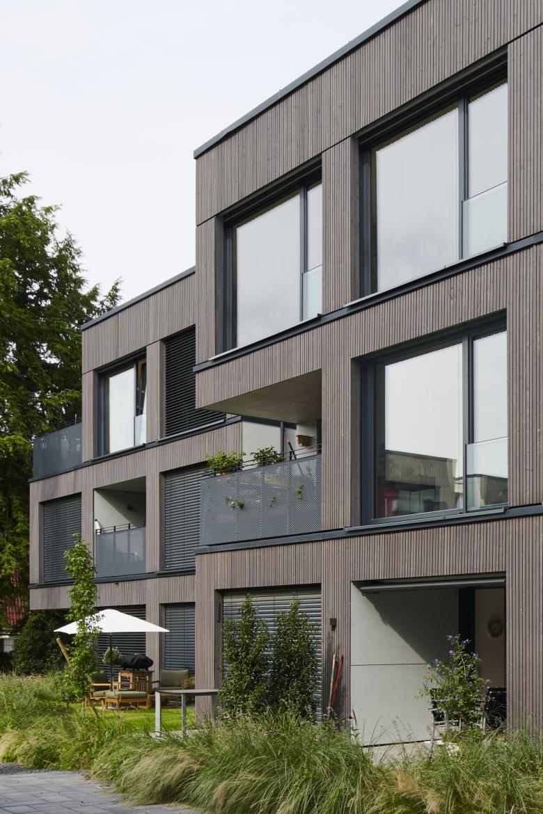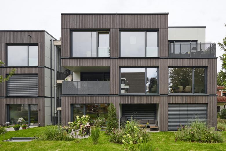 Along with one existing structure, two new apartment buildings - each split into two by a transparent stairway - shape an inviting, green courtyard that serves as a shared community resource. Designed for high energy efficiency, the new buildings feature renewable wood as a primary construction material, which is used both in structural elements as well as façade cladding. Each apartment contains at least one generous terrace or loggia.