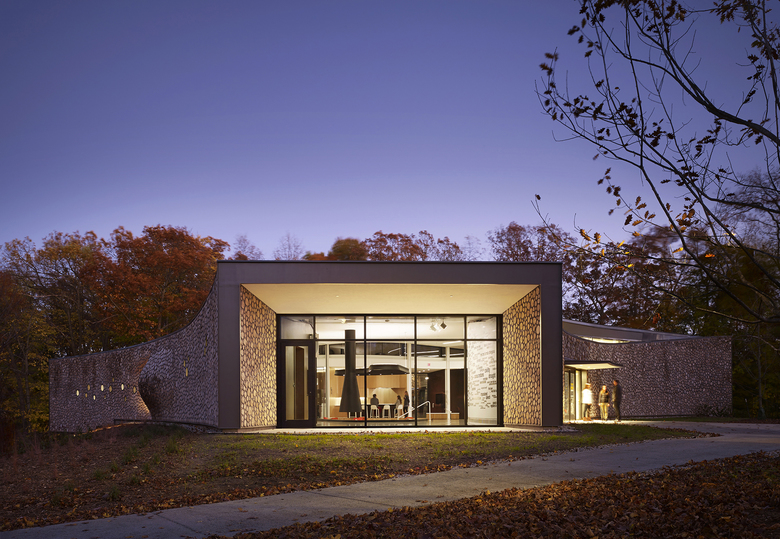 The Center’s architecture supports this work in several important ways. Inside, the building’s visually open and day-lit interior is designed to encourage “convening” in configurations that begin to break down psychological and cultural barriers between people and help facilitate understanding. The presence of a living room, hearth, and kitchen for sharing food at the center of the building creates the potential for frequent informal meetings and casual or chance encounters.
