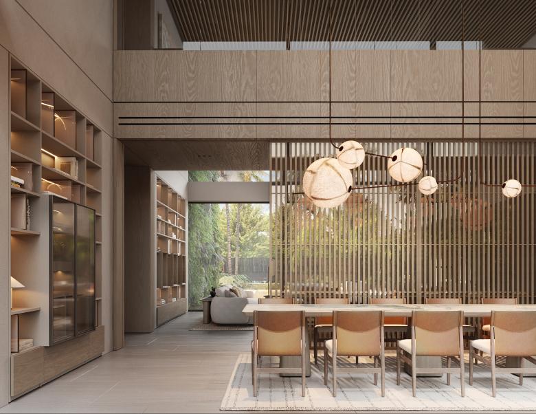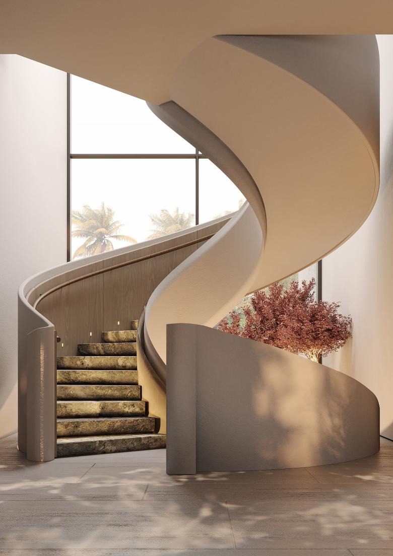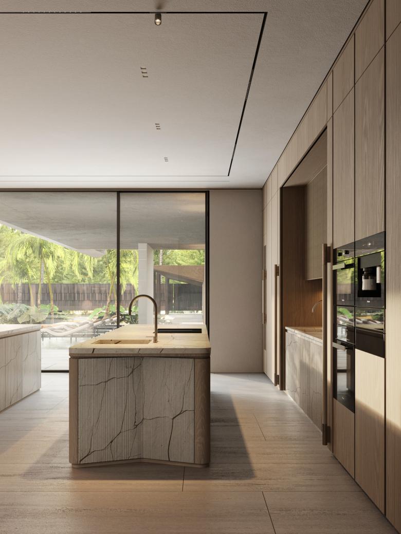 The core idea behind Ashen Villa was to integrate functional adaptability within the living spaces. The client was given the flexibility to choose how each room could evolve over time. For example, bedrooms can be converted into offices or children's rooms, depending on future needs. The design emphasizes fluidity, with spaces flowing into one another. The use of light-green marble, sourced from the client's stone factory, became an essential element, featured prominently in key design details such as the fireplace and staircase.