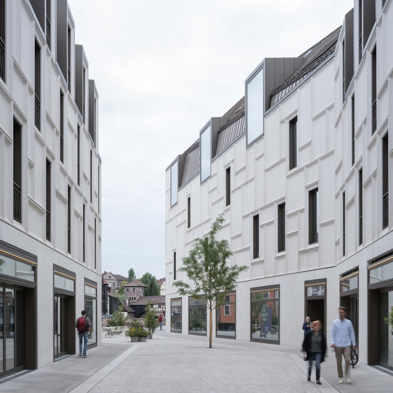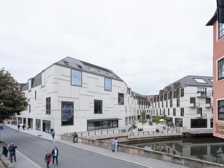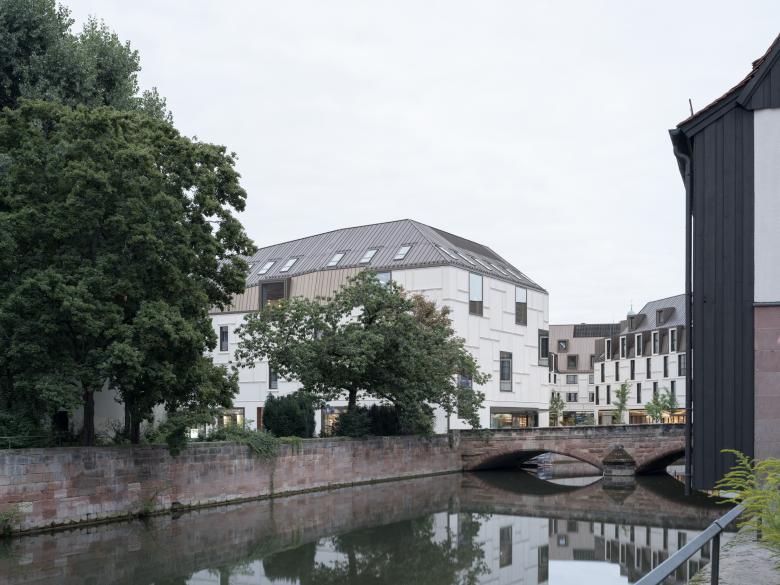 The central location in Nuremberg’s Old Town and an idyllic setting direct on the banks of the River Pegnitz are the hallmarks highlighting the quality of this site. The aim of any urban planning for this area must be to create new buildings whose dimensions are in keeping with the setting and that make its outstanding qualities available to as many users as possible. The idea was to develop a city quarter that would integrate itself unobtrusively and matter-of-factly in the historic Old Town and yet not deny its independent modern identity.