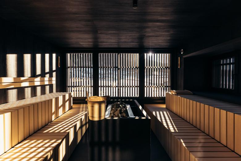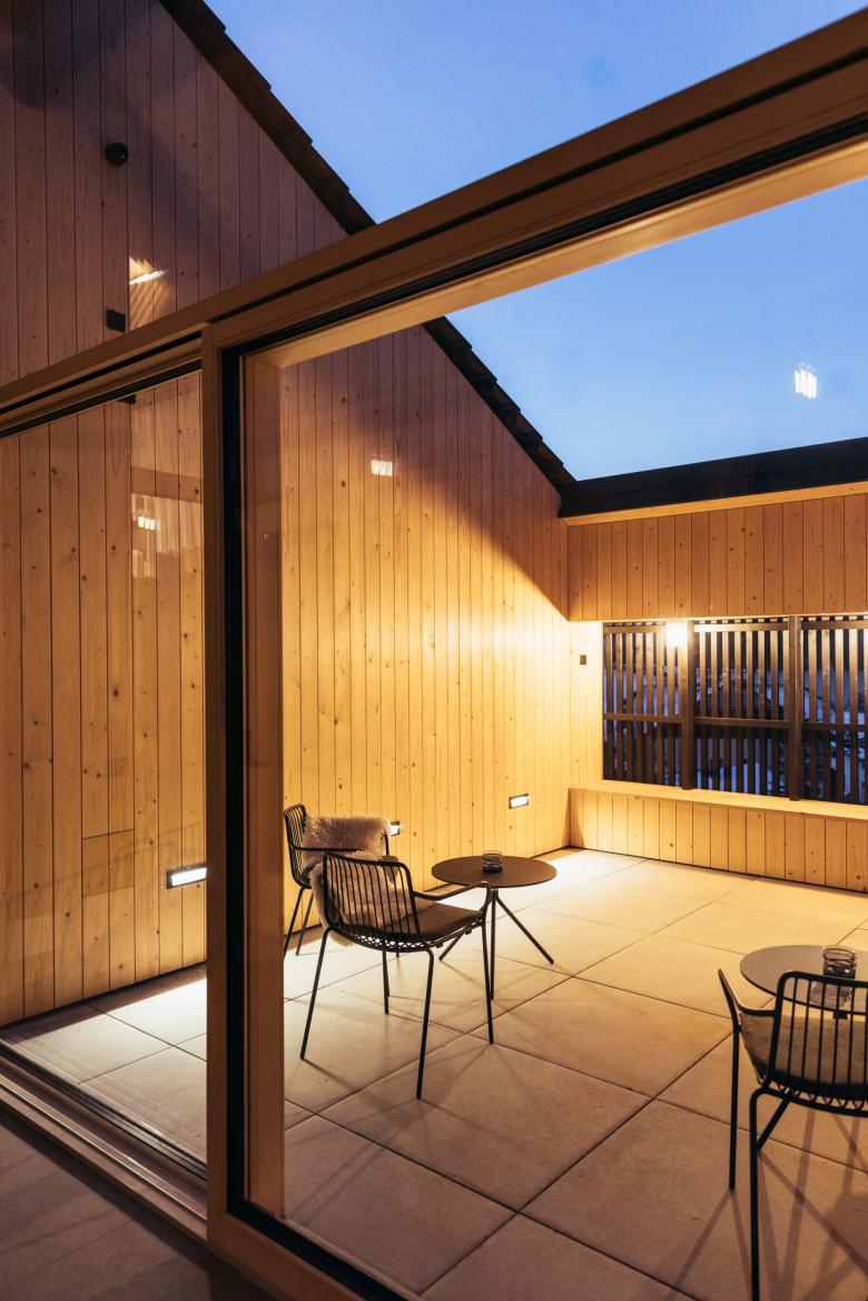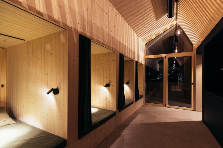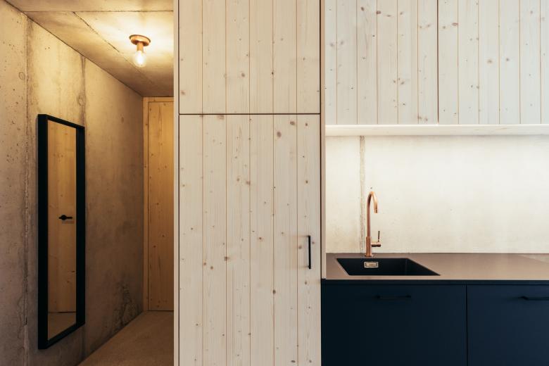 Im Inneren wechseln sich Sichtbeton, verputzte Ziegelwände und Holzverkleidungen ab. Die Wohnräume sind mit geschliffenem Estrich ausgestattet, die Nassbereiche mit schwarzen Fliesen und kupfernen Armaturen. Holzinnentüren und dreifach verglaste Fenster mit Holzrahmen aus lokaler Fichte tragen zur warmen Atmosphäre bei.