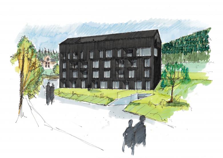 Das geplante Hotel in St. Valentin auf der Haide nimmt direkten Bezug zur alpinen Umgebung. Inspiriert von den traditionellen Stadelbauten der Region, vereint es eine klare, quaderförmige Form, ein steiles Dach und natürliche Materialien zu einer harmonischen Verbindung von Moderne und Tradition.