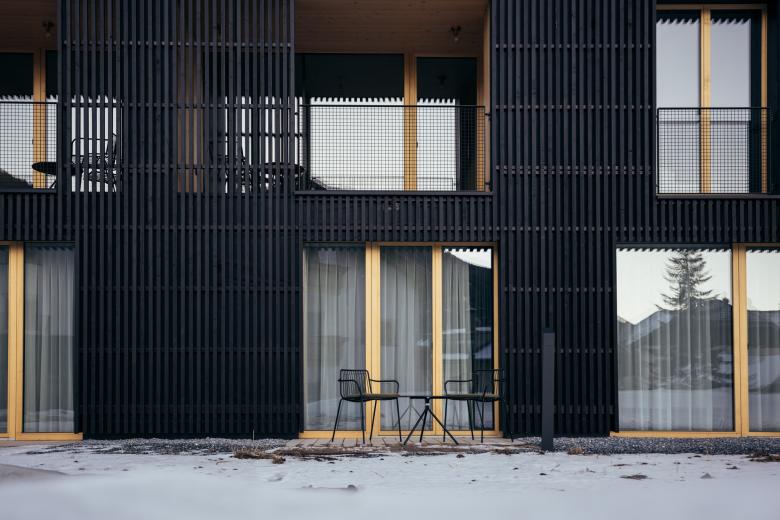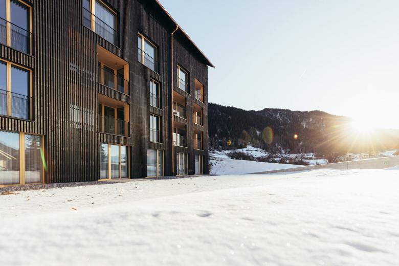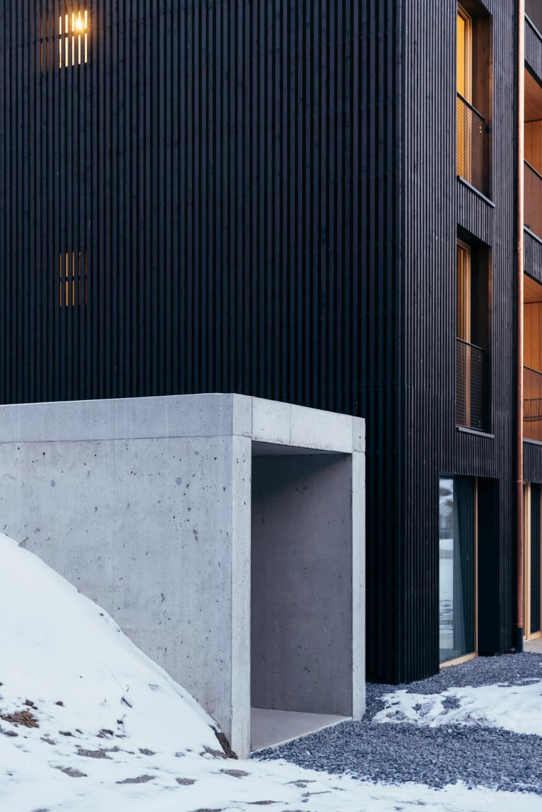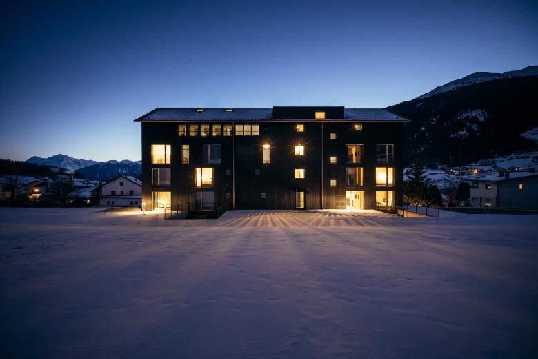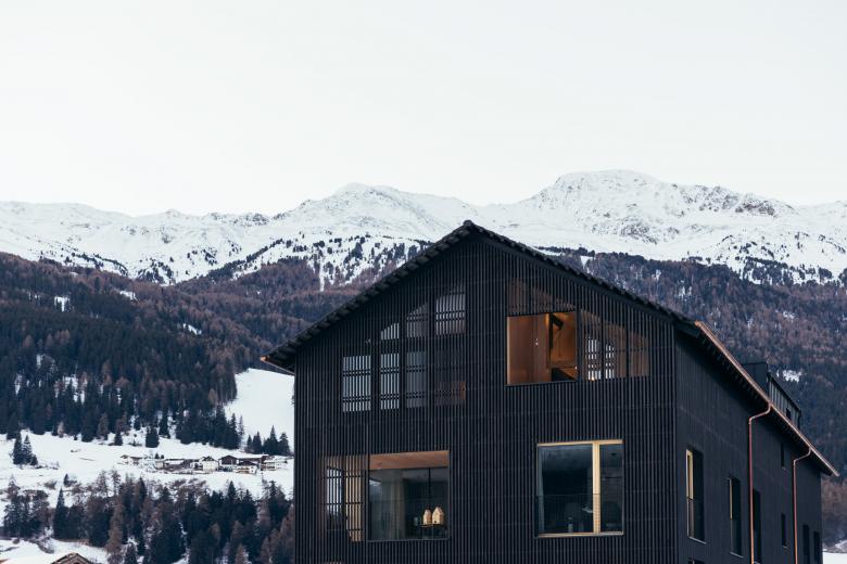 Ein zentrales Anliegen war die behutsame Integration des Gebäudes in die unberührte Obervinschger Landschaft. Die größte Herausforderung bestand darin, die große Kubatur als unaufdringliche Architektur zu gestalten, die dennoch höchsten Wohnkomfort bietet. Die reduzierte Formensprache, die dunkle Holzfassade und die landschaftsbezogene Gestaltung der Außenräume ermöglichen eine Balance zwischen Architektur und Natur.