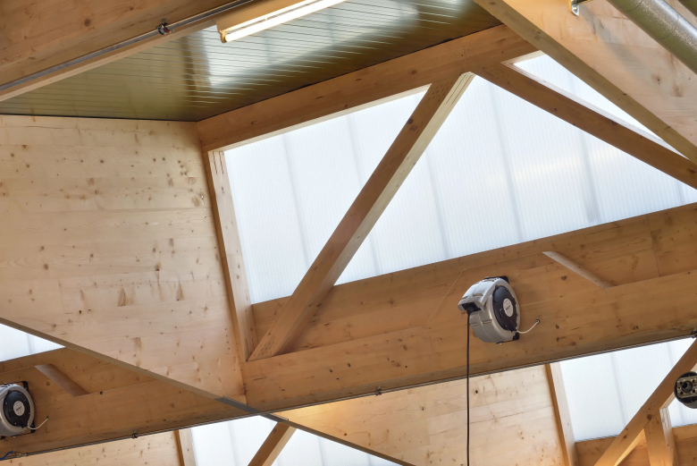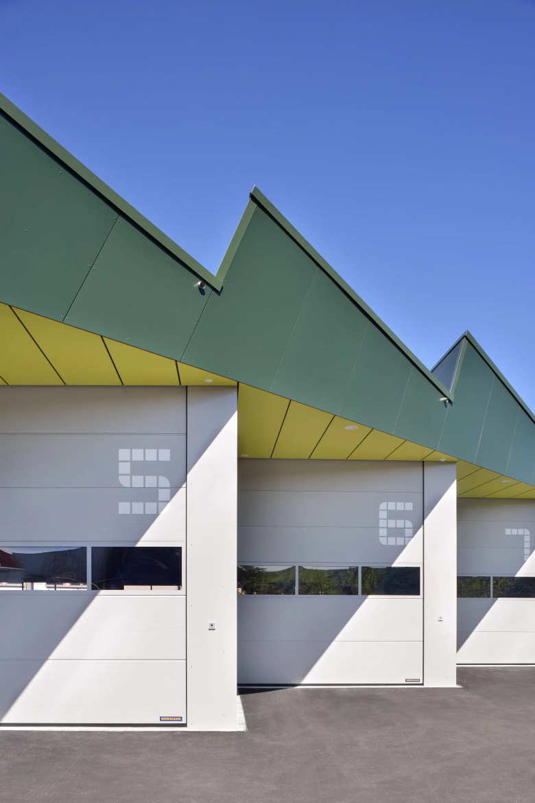 Um möglichst viele Fahrzeuge für Militär und Feuerwehr auf eng bemessenem Raum in einer Garage unterzubringen, wurde das Gebäude mit einer abgetreppten Front so nahe wie möglich an die Grundstücksgrenze gebaut. Durch die vier in diagonaler Richtung angeordneten Tore können bis zu sieben Tanklöschfahrzeuge bequem einfahren und so geschützt parkiert werden. Das grosse stützenfreie Sheddach liegt wie ein Deckel auf den Schottenwänden und nimmt mit den diagonal versetzten Rändern die Fluchten der bestehenden Bauten in der Umgebung auf.
