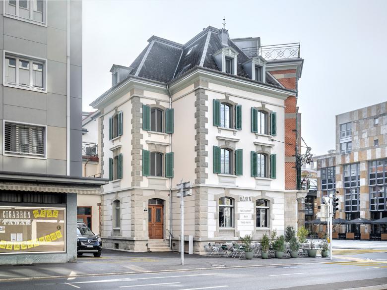 Der Eckbau mit dem Restaurant Bären, ein dreigeschossiger Bau in Neorenaissanceformen mit auffällig in Erscheinung tretenden Eckerker wurde 1896 von Dagobert Keiser Vater als eigenes Wohnhaus erbaut. 1898 erfolgte gegen Osten ein Terrassenanbau zur Vergrösserung der Gastwirtschaft. Der Bären, die «Werkstatt 3» wurde von den Fabrikmitarbeitern der damals südlich angrenzenden Metallwarenfabrik rege besucht. 2014 erwarb die Zug Estates AG die Liegenschaft.