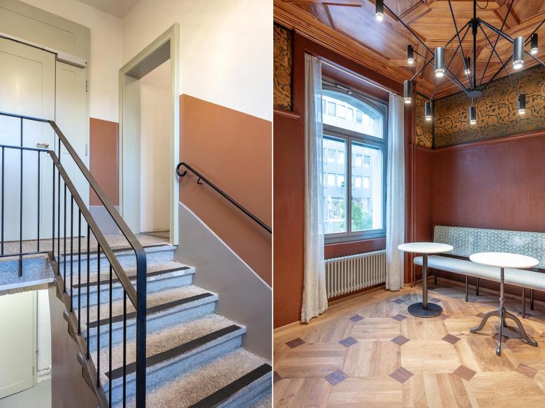 Diverse störende Einbauten der vergangenen Jahrzehnte wurden zurück gebaut und die betrieblichen Abläufe an die bauzeitlichen Strukturen ausgerichtet, neu organisiert. In einer präzisen, fein abgestuften Umsetzung konnten die bauzeitlichen Gaststuben, die Treppenhäuser sowie die Fassaden nach denkmalpflegerischen Anforderungen und Farben gemäss Befund sorgfältig repariert, ergänzt und restauriert werden. Besonders überraschend wurde im Sääli im oberen Wandbereich unter einer leicht abwaschbaren Farbschicht eine bauzeitliche Schablonenmalerei entdeckt und wieder sichtbar gemacht. Die bauzeitliche Arbeiterbeiz mit dunkelbraunen Wand- Deckenverkleidungen aus massivem Holz konnte befreit von Störungen sichtbar gemacht werden.