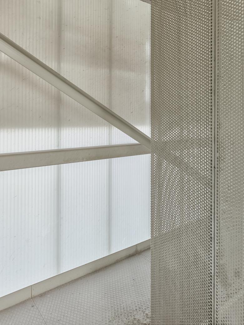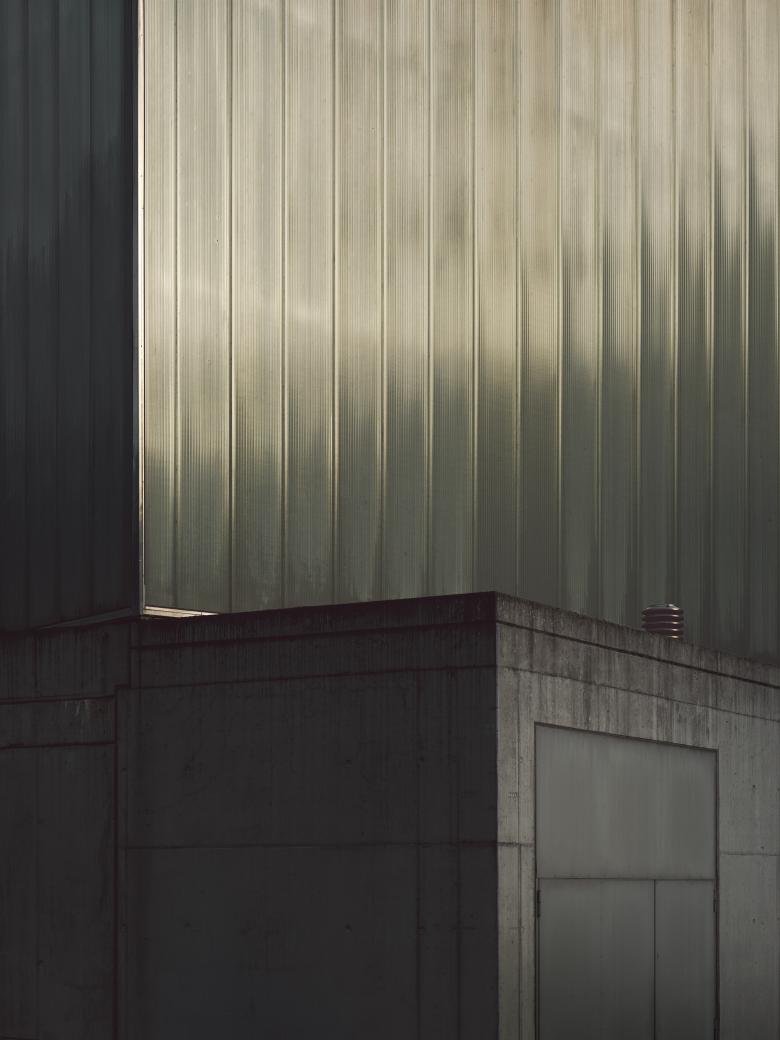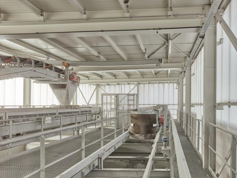 Der Ansatz führt auf Ebene der Materialwahl zur ebenfalls sorgfältigen Unterscheidung und Gliederung in einen massiven und robusten Sockel aus Sichtbeton, der während des Betriebs auf einer schleifenartigen Bahn ständig von den Fahrzeugen umfahren wird. Dem leicht wirkenden Aufbau aus Polycarbonat-Elementen im oberen Bereich kommt eine andere Aufgabe zu: er umhüllt die durchscheinenden Analgen aus Silos, Laufbändern und Leitern halbtransparent, sodass die Abläufe innerhalb der Hülle für jeden nachvollziehbar werden. Bei Nacht verstärkt sich dieser Effekt durch eine innere Beleuchtung. Ausserhalb der Betriebszeiten wird so die Maschinerie, also die alles tragenden Anlagen, vollständig zur Corporate Identity der Betonaufbereitungsanlage.