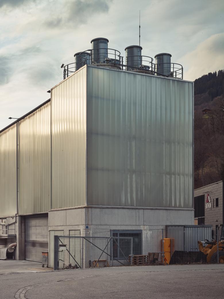 Den einzelnen technischen Bestandteilen einer Betonaufbereitungsanlage - an der Haupttransversale durch das Prättigau gelegen - eine Hülle und damit eine nach Aussen hin einheitliche Identifikation zu geben war einer der Ansatzpunkt dieses Projektes. Da diese Hülle vor allem auch Ausdruck der funktionale Abläufe wie Anlieferung, Aufbereitung und Verladung sowie Steuerung der ganzen Anlage ist, folgt und bekleidet sie präzise diese technische Form.