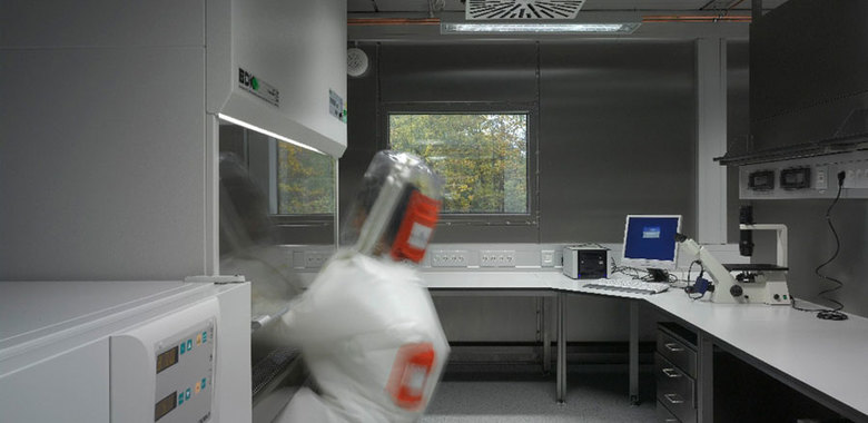 A red cube constitutes the extension building of the Virology Institute at the Philips University. The build-ing is connected via a white bridge and is used for virological research with its BSL4 laboratory.