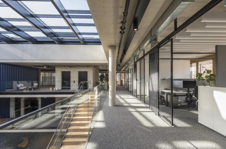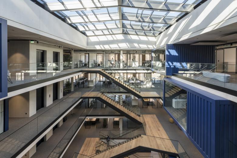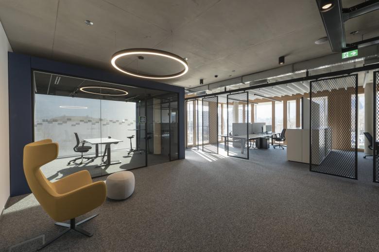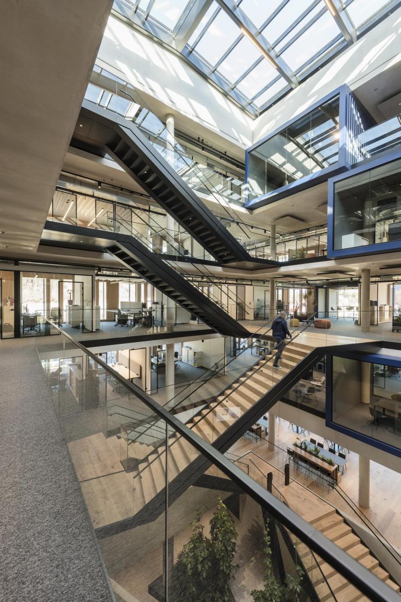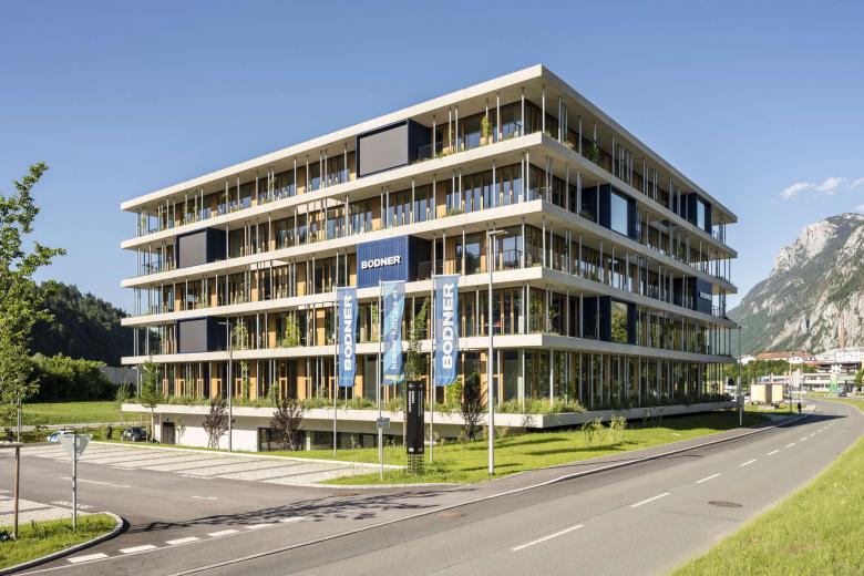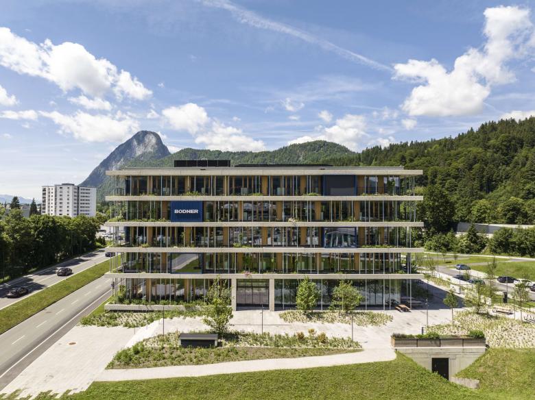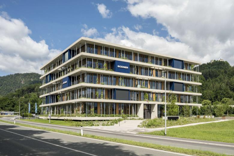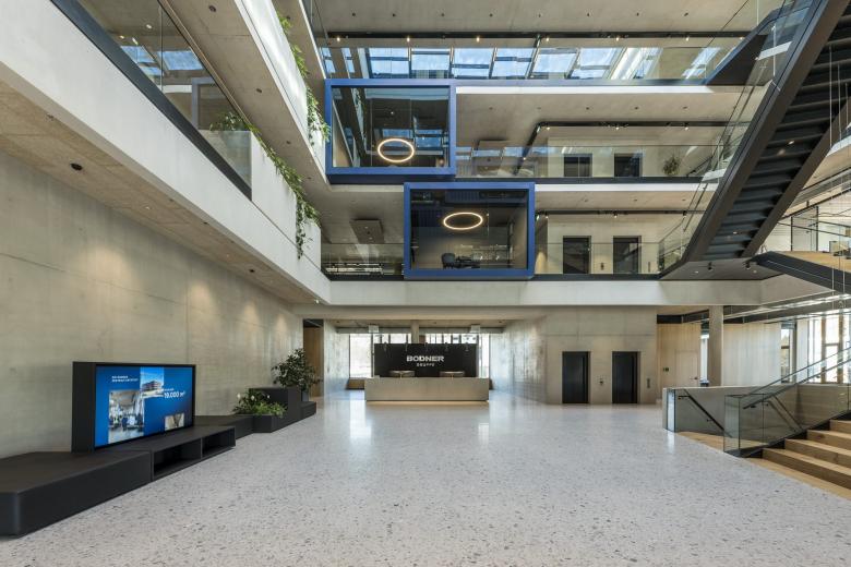 Die Zentrale ist Teil des BODNER Campus, der im Endausbau aus vier Gebäuden bestehen wird. Das architektonische Konzept des Gebäudes zeichnet sich durch massive, markante Strukturen aus. Damit wird auf die Wurzel und die Geschichte des Bauherrn und sein Kerngebiet als Bauunternehmen hingewiesen. Das äußere Erscheinungsbild zeigt Elemente von Rohbaustrukturen in Form von grob geschnittenen Deckenrändern und Assoziationen von Baustellen‐Containern im bekannten BODNER‐Blau. Durch präzise Detailausbildungen von Verglasungen, Fertigteilverkleidungen und Fensterelementen erzeugt die Baustellenthematik im neuen Kontext ein spannendes und identitätsstiftendes Erscheinungsbild. Das Gestaltungskonzept zieht sich von der Fassade in den Innenraum. Hier dienen die Container‐Boxen als Rückzugsräume und Besprechungskojen und zeigen sich in freier Anordnung im überdeckten Atrium.