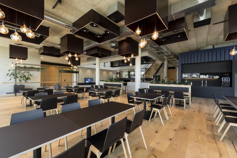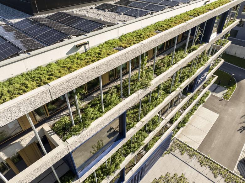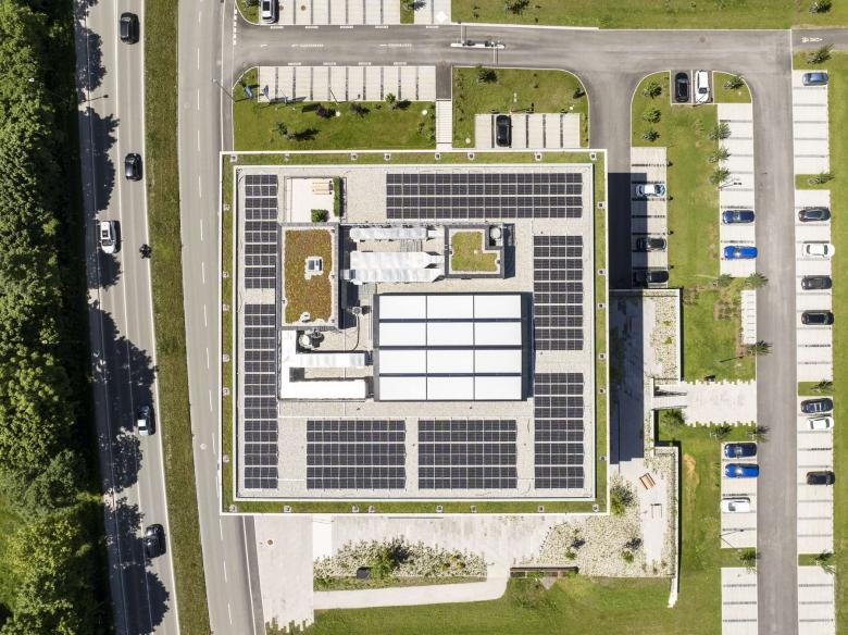Die Heizenergie wird durch Wärmepumpenanlagen bereitgestellt, die sowohl Grundwasser als auch elektrische Energie, die mittels einer großflächigen PV-Anlage am Gebäude bereitgestellt wird nutzen.
