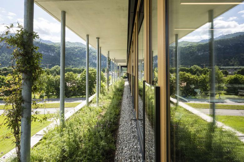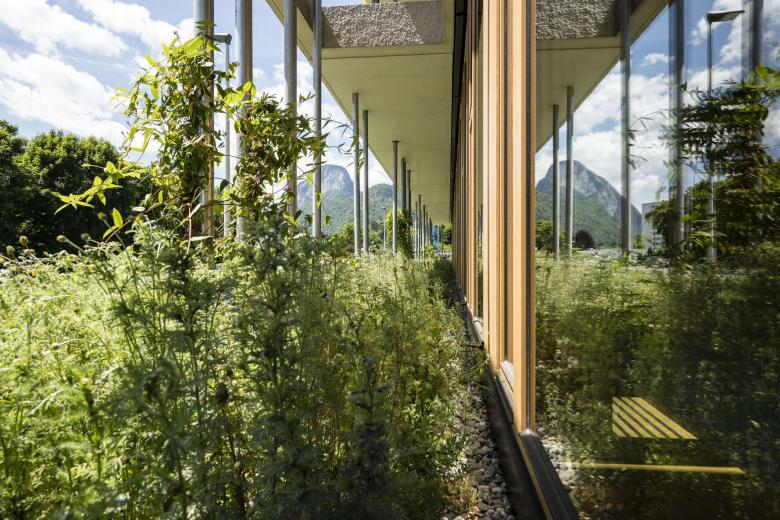 Das Haus ist eingebettet in einen großzügig bepflanzten Außenbereich, begrünte umlaufende Balkonplatten bieten Vorgärten in allen Geschoßen.