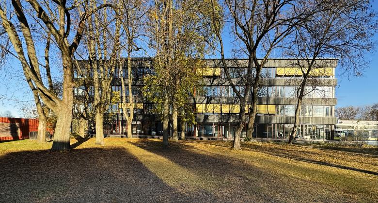 Fassadenbrüstungen in Holzrahmenbauweise mit hinterlüfteten Holzlatten machen die Konstruktion von außen sichtbar. Die beiden Treppenkerne aus Sichtbeton dienen zum Aussteifen des Holzskelettbaus aus Holzstützen und Unterzügen. Ein grundwasserbasiertes CO2- freies Heiz- und Kühlsystem, Dachbegrünung und Photovoltaik helfen, den KfW-40-Standard zu erreichen. Terrassen im Erdgeschoss und eine große Dachterrasse mit Blick auf die Altstadt sorgen für eine angenehme Arbeitsatmosphäre.