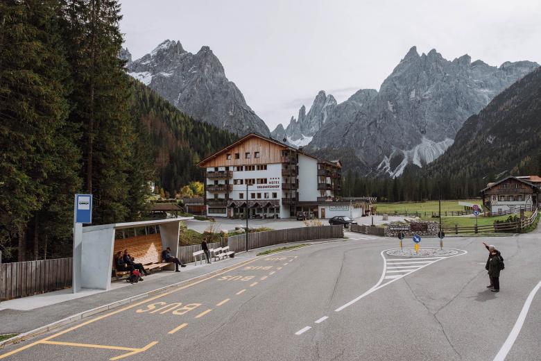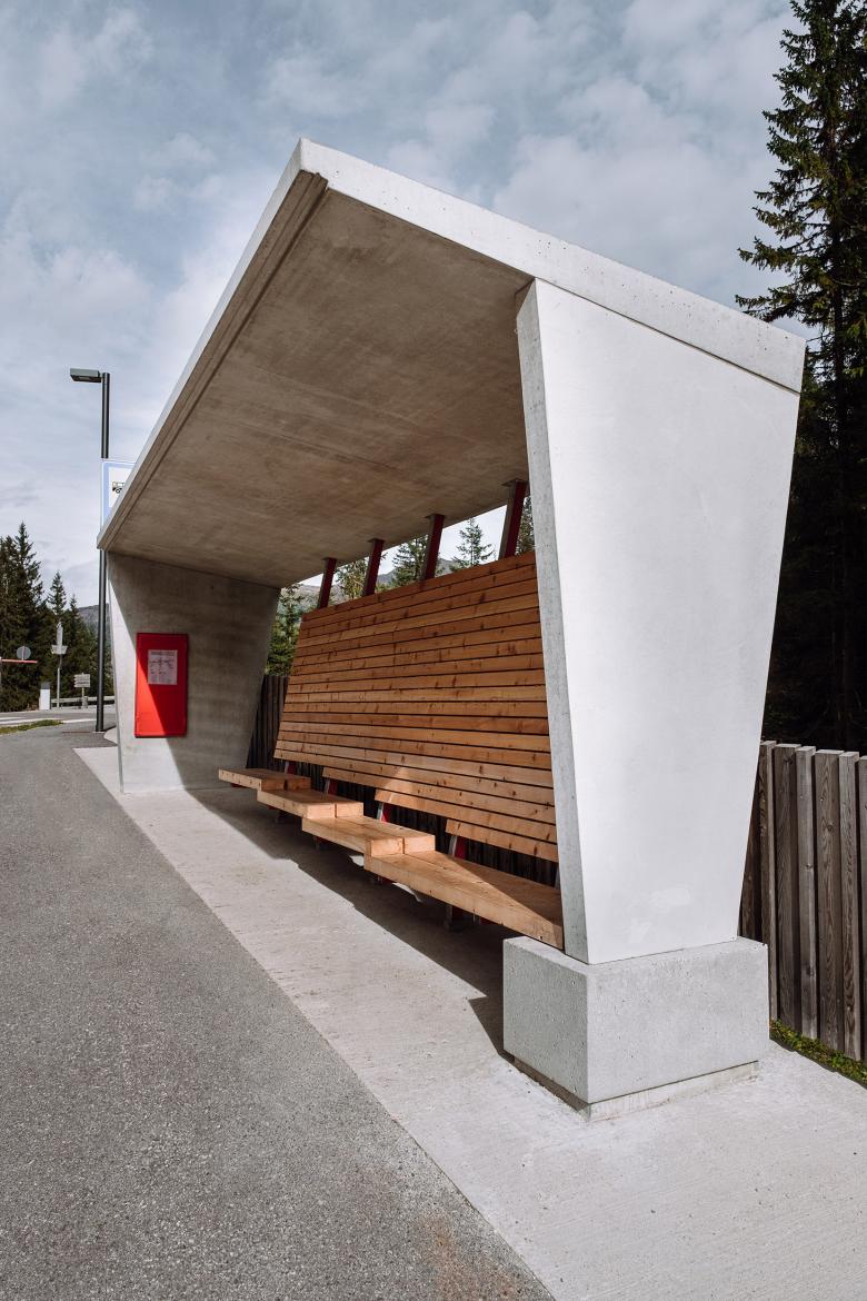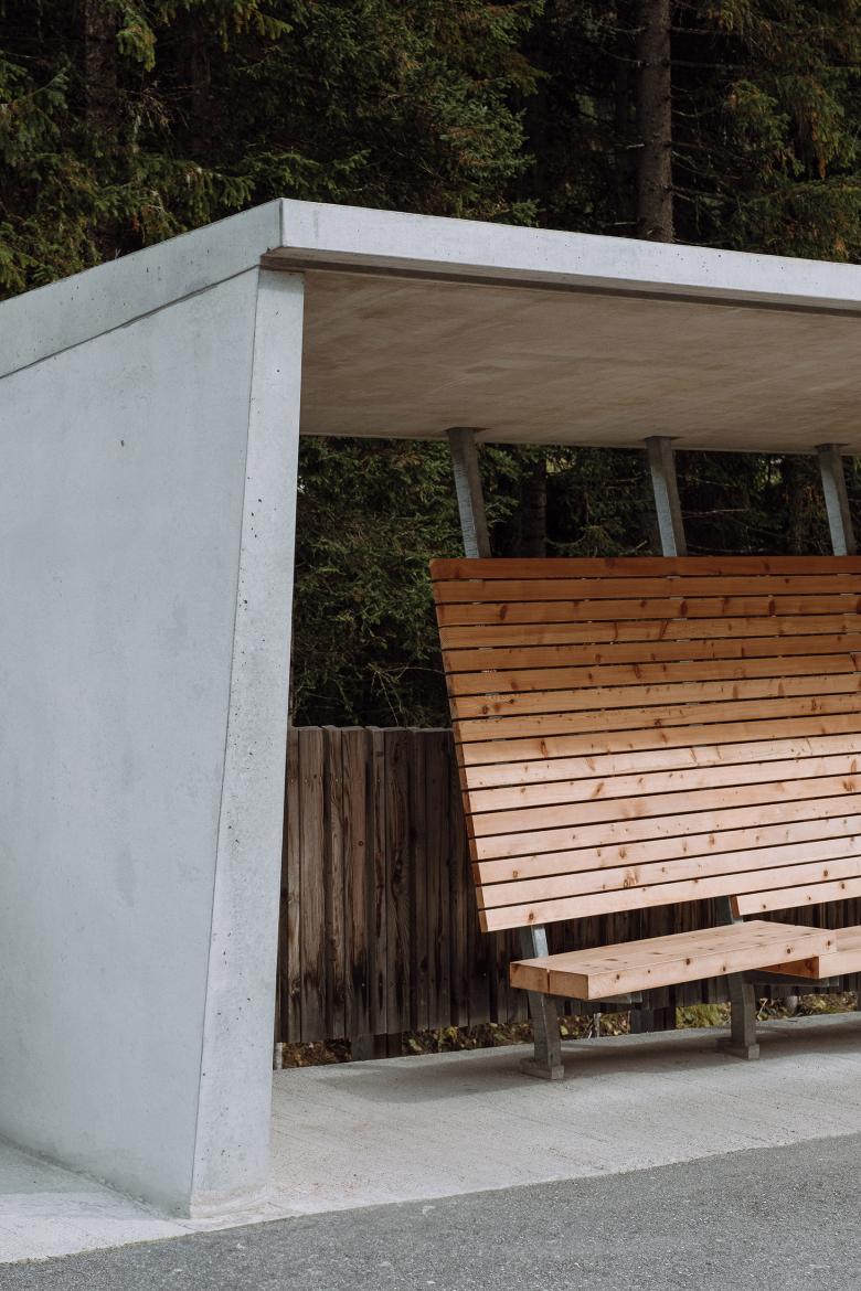 The individual elements are made from durable materials: galvanized steel parts are combined with concrete elements of various surface finishes, using dolomite rock aggregate and local larch and pine wood. The limited use of color is borrowed from Sexten’s logo. The concrete parts are prefabricated, cast in the factory for quick assembly on-site, and the molds are reusable for future bus stops. The larch wood comes from a windfall in the local forest and is used for the vertical wooden surfaces. The seating is made of pine wood, which does not splinter. Concrete provides durability in the harsh alpine climate, while the wood adds warmth—both materials harmonize with the natural surroundings, characterized by extensive forest areas and pale mountain walls.