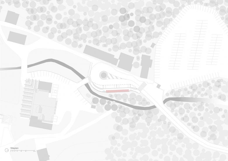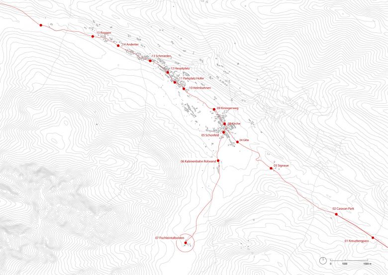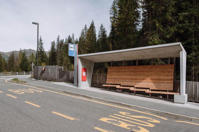 The shelter is designed to convey essential information in a small display case, provide enough sheltered seating, ensure clear visibility between bus drivers and those waiting, and offer a view of the surrounding landscape. A defining feature of the bus stop is the so-called "summit bench," designed by Plasma Studio in 2019 for the furnishings of the village of Sexten.