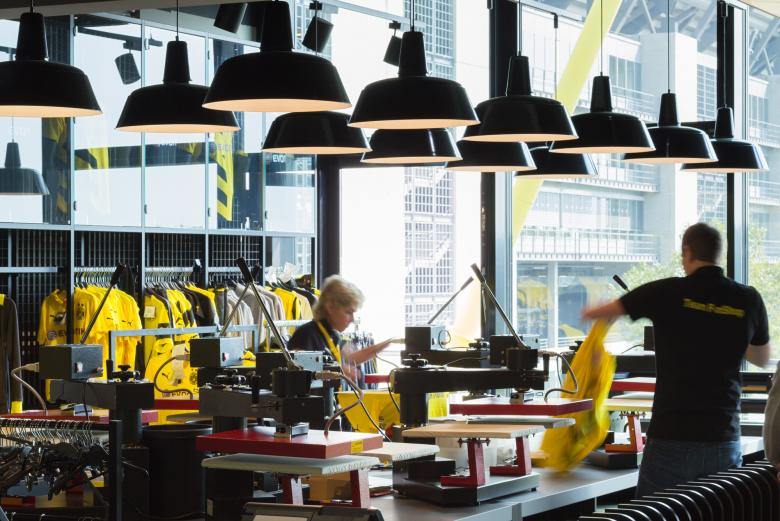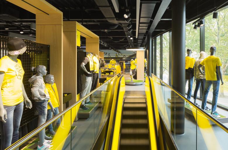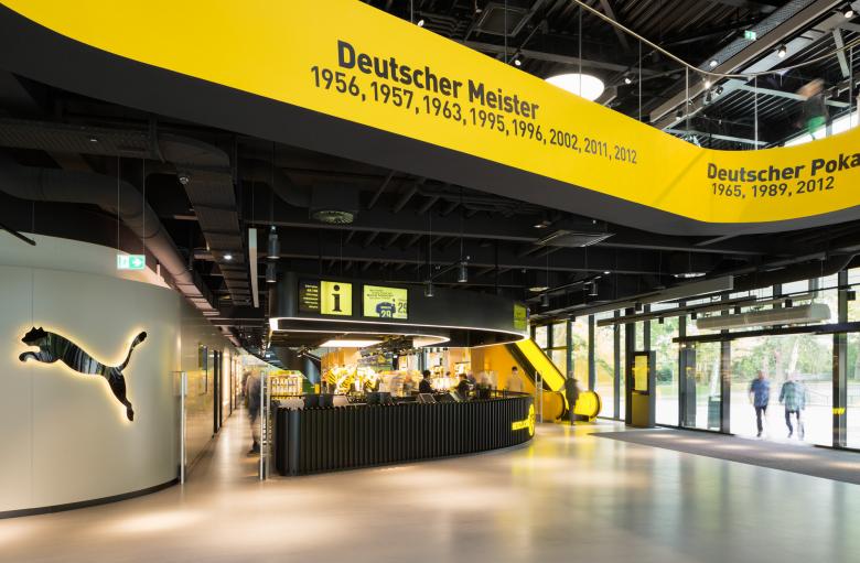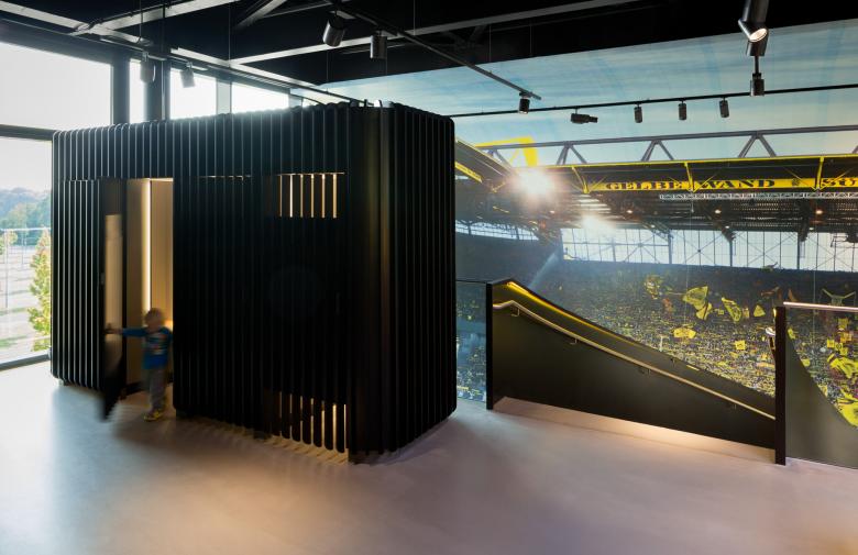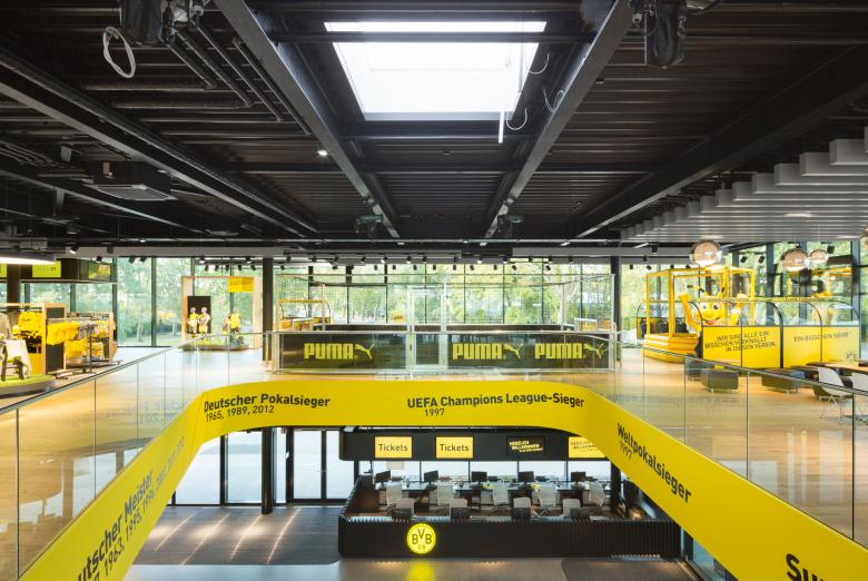 Ihr Verein ist alles, alles ist schwarzgelb. Sie lieben den Fußball, das Spiel, das Erlebnis, das Dabeisein, das Fansein. Für sie haben wir direkt neben dem Stadion die BVB FanWelt gebaut. Naturgemäß stellt ein Fußballstadion jedes zweigeschossige Haus in den Schatten, doch Fans jeden Alters finden hier auf 2.500 Quadratmetern ihre Welt und ihren Zugang zum Verein. Hier werden an bis zu 20 Schaltern Tickets verkauft, der Shop bietet über 1.000 Fanartikel an, Trikots werden direkt beflockt, es gibt ein Reisebüro, eine Cafeteria mit Terrasse, ein Mini-Fußballfeld, Kinderspielbereiche mit Bällebad für die Kleinsten, interaktive Ausstellungsflächen und sogar eine stilisierte Version der Südtribüne, der legendären gelben Wand. Das ist wahre Größe.