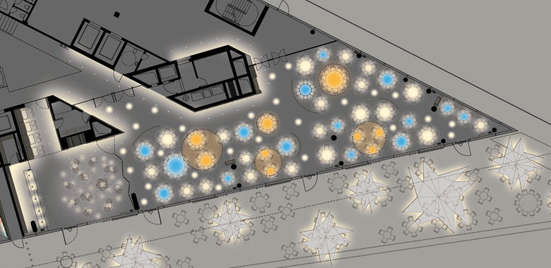 Thirty-eight custom-designed lighting objects support the structuring of the large space. Equipped with dimmable compact fluorescents, and with a focussed LED-spot in the center, they are truly floating, in three different diameters. Some of them are being reflected in large, yellow, reflective "dishes". Designed with a punctual "white dot pattern" the star-arrangement of the light bulbs remains visible from below as well as in the polished, reflective dish above. The designers did not want to hide the bulbs completely, also to achieve a kind of "jelly fish" appeareance (association to Hamburg, Harbor, North Sea).