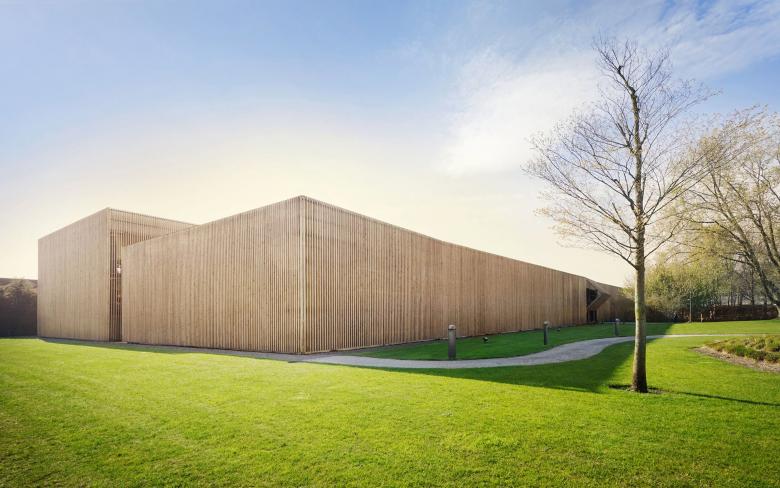 The form of the two parts of structure results from the system of two parking ramps. The two identical, mirror-symmetric building parts complement each other on the inside [circular driving] as well as on the outside. Due to this selected system it was possible to arrange the number of parking bays demanded in the competition in the rear part of the L-shaped property. The open space between Calatrava’s distribution centre and the new car park is arranged with grass cushions and several trees alike the existing Campus. Entrance and exit of the parking garage lie in the middle of the building, accentuated by a large folding gate. The system of the two park ramps offers an optimal utilization of space. The overcoming of the storeys takes place on 3.2 % sloped “roads”. Thus no additional up and departure elements are needed such as spindles or ramps. The pleasant slope results from the length of 127 meters and the storey height of 3.06 meters, generous for a multi-storey car park. The in section x-shaped ramps make separate drives up and down the ramps possible. A timber facade lends a natural feature to the multi-storey car park. From the inside like from the outside the wood gives the building an overall friendly character. „The garden fence front “is the ideal mediator between the residential area on one side and the industrial area on the other side. Both building parts are enclosed over the entire length and width with square-shaped timber.