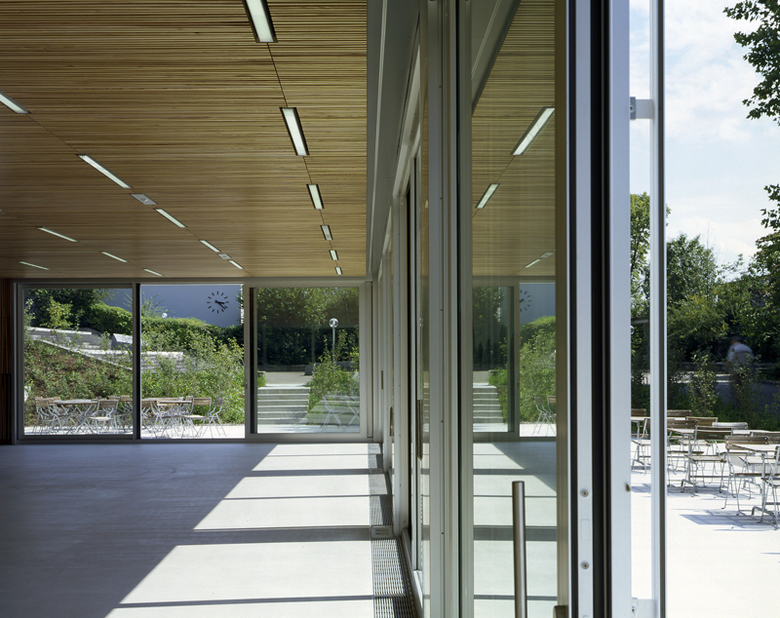 Der Mensaraum ist das Herzstück der neuen Anlage. Die in jeder Hinsicht komplexen Anforderungen sind in eine Ruhe ausstrahlende Einfachheit eingearbeitet worden. Als akustisch dämpfendes Baumdach breitet sich geöltes Ulmenholz über Wände, Stützen und Decke zu einem textilartigen Geflecht aus. Raumhohe Hebeschiebfenster aus natureloxiertem Aluminium vermitteln zwischen Terrasse und Mensaraum. Der innere fugenlose und eingefärbte Fliessmörtelbelag findet im Aussenbereich als monolithischer Betonbelag seine Fortsetzung.