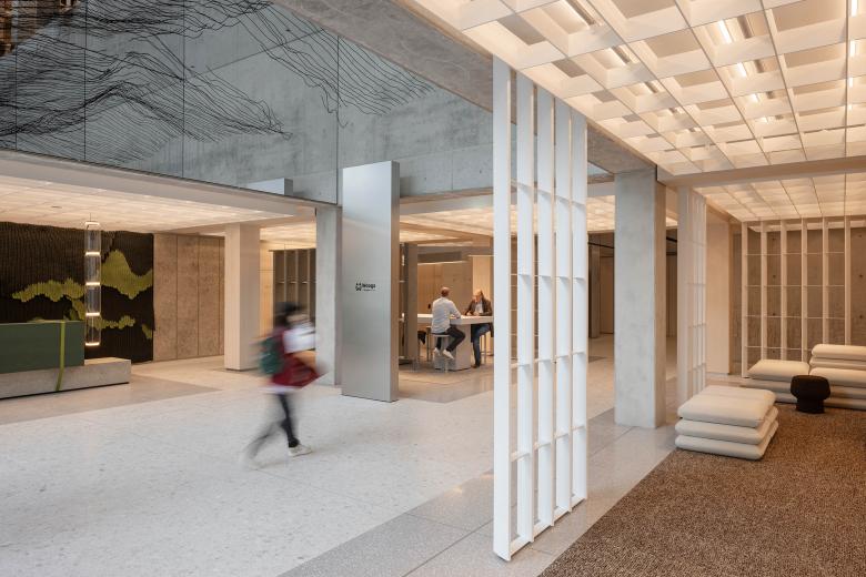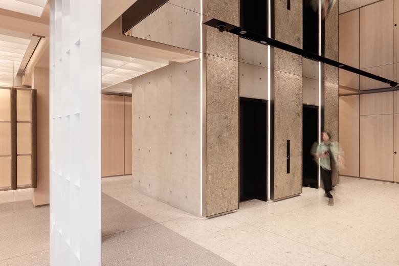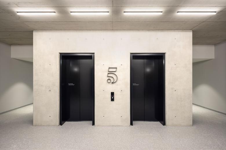 The lobbies, the marketings suite and the signage system were designed by Ippolito Fleitz Group. The art installation under the ceilings of the lobbies was created by Julius von Bismarck and is entitled ‘Die Luft muss man sich wegdenken’ (‘One Must Think Away the Air’). The nylon art objects behind the reception desks are made by the Korean artist Kwangho Lee.