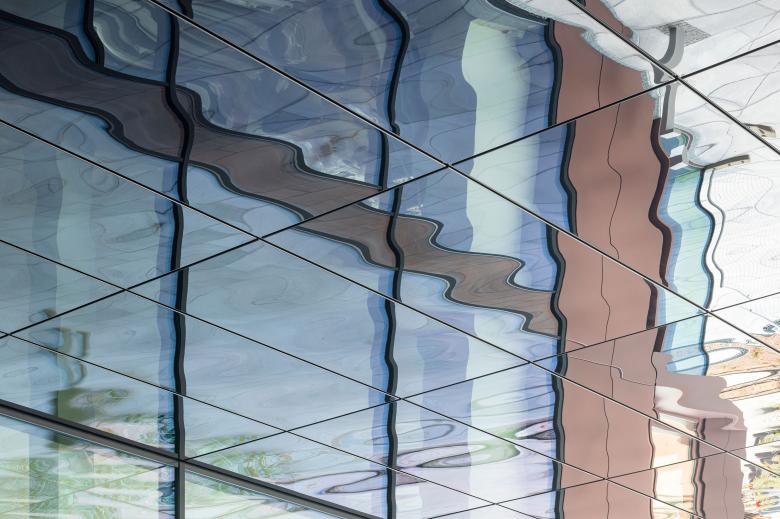 The bottom two storeys of the linking structure function as an open, pillar-free passageway. The ceiling of the passageway is fitted with mirrored stainless steel sheets in Onyx Black, which create flowing reflections - a tribute to the location of the ensemble directly on the water.