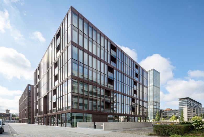 Dockyard, a modern seven-storey office building complex with an underground car park, was built in Berlin's Osthafen using a sustainable, climate and resource-friendly timber hybrid construction method. The Dockyard project comprises a square and a rectangular building, between which is a glazed linking structure with visible trusswork made from sustainable construction beech.