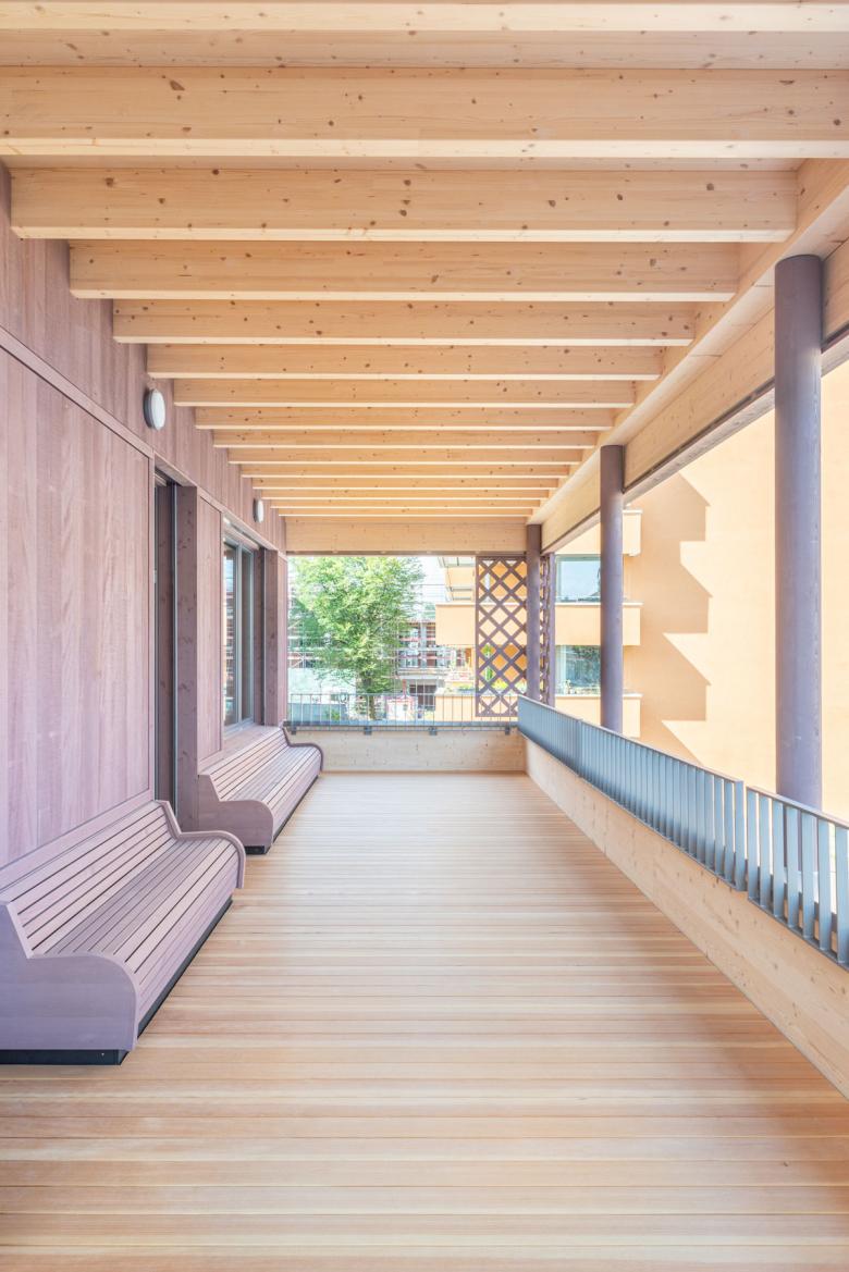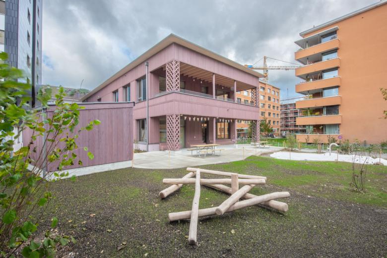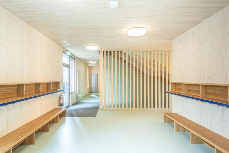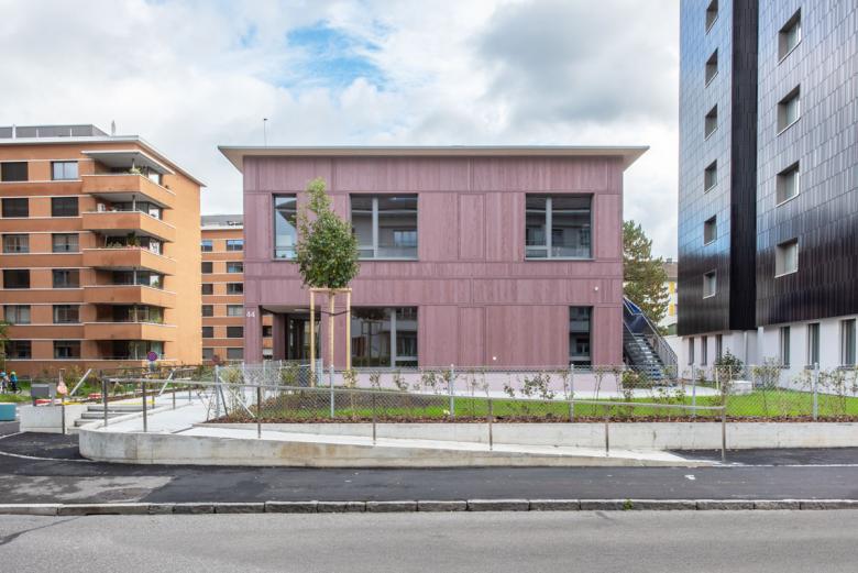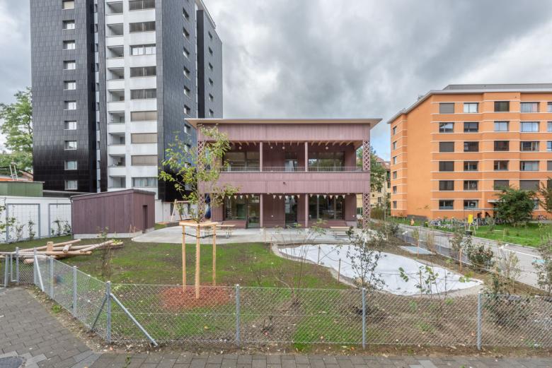 Die Fichtenholzfassade mit geschlossener vertikaler Schalung in Nut und Kamm wird durch unterschiedliche Felder strukturiert. Ihre Oberfläche wird in einem Rot-Ton behandelt. Die Ecken der gedeckten Aussenräume werden mit Holz-Rauten-Gittern ausgezeichnet. Im Bereich der gedeckten Aussenräume werden Sitzbänke in die Fassade integriert. Eine aussenliegende Fluchttreppe mit Rutsche verbindet den Garten mit dem Obergeschoss und stellt für Lehrkräfte und Kinder einen schnellen und attraktiven Zugang sicher.