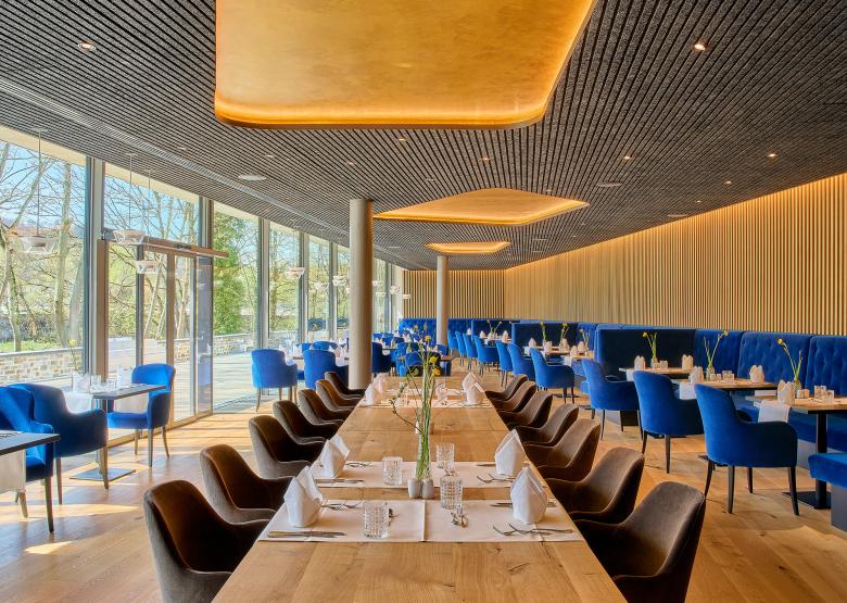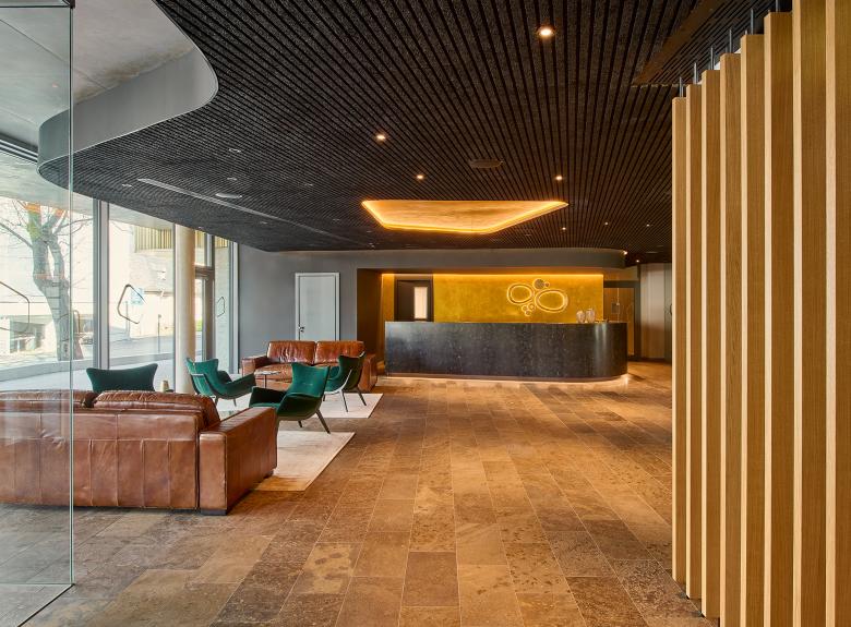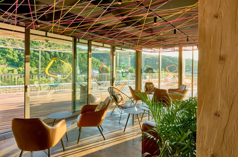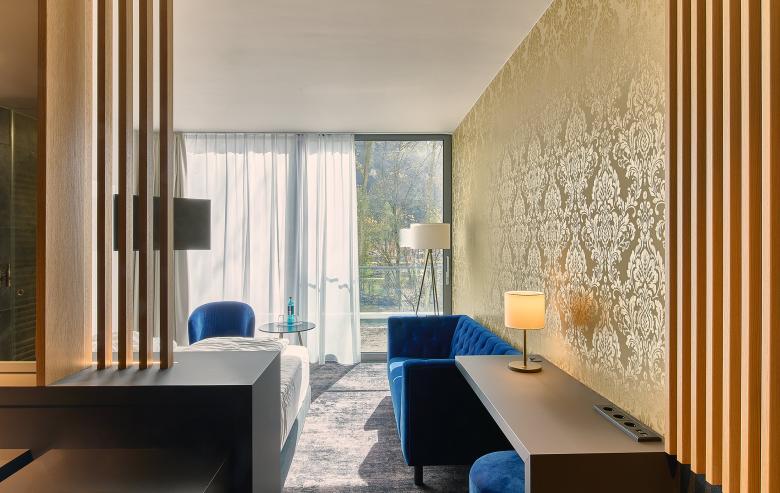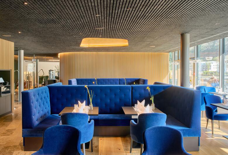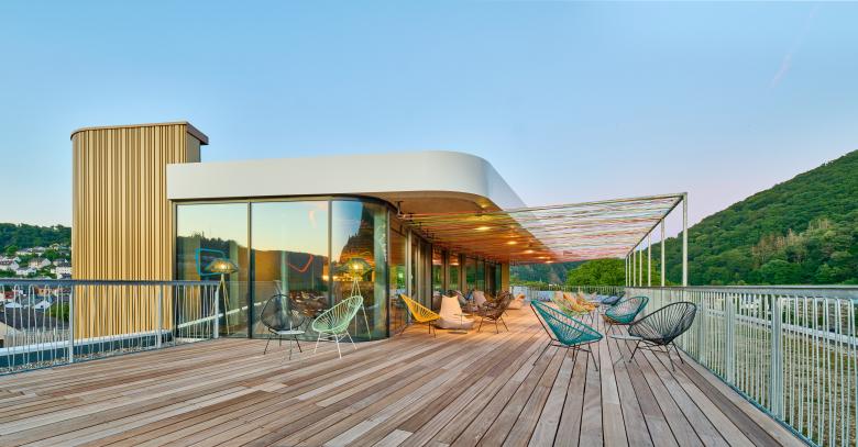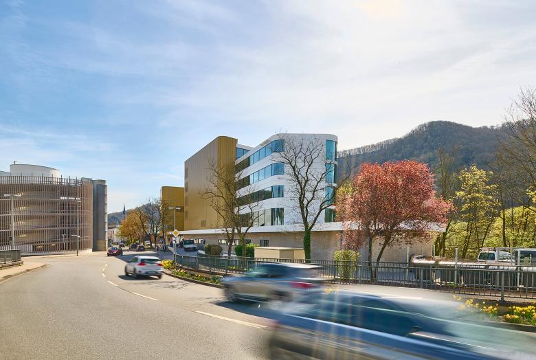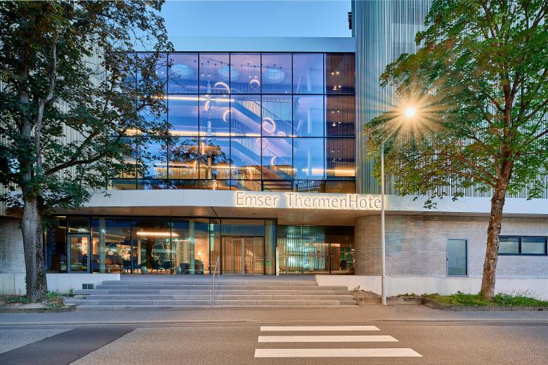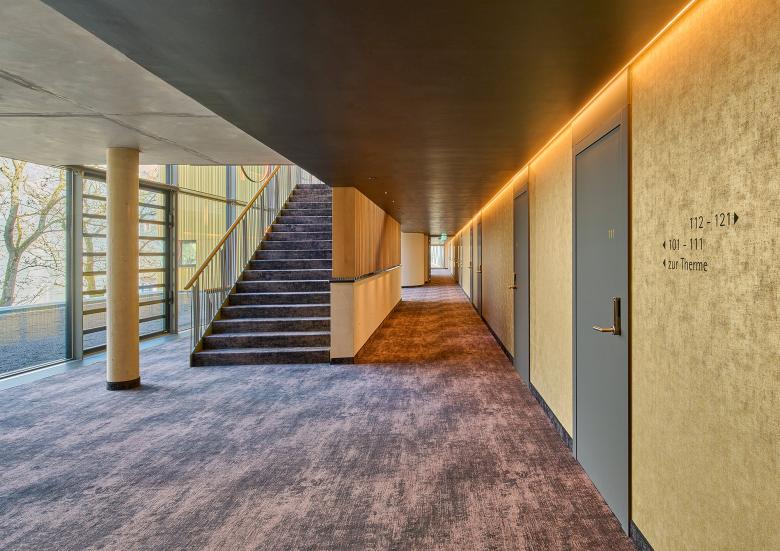 The ground floor houses the foyer, restaurant and bar as well as the seminar rooms, the latter facing south. The adjoining rooms, on the other hand, are on the street side and form a protective back to Viktoriaallee. Here, large-scale glazing as well as projections and recesses in the façade design lend the new building a loose and transparent appearance in the urban space. For maximum quality of stay, all rooms on all four levels are south-facing, with an unobstructed view of the Lahn. The Thermenhotel thus offers an ambience for feeling good and relaxing - in addition, the entire bathing and wellness programme of the neighbouring Emser Therme is available to guests via a bathrobe corridor on the first floor.
