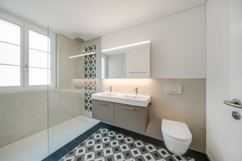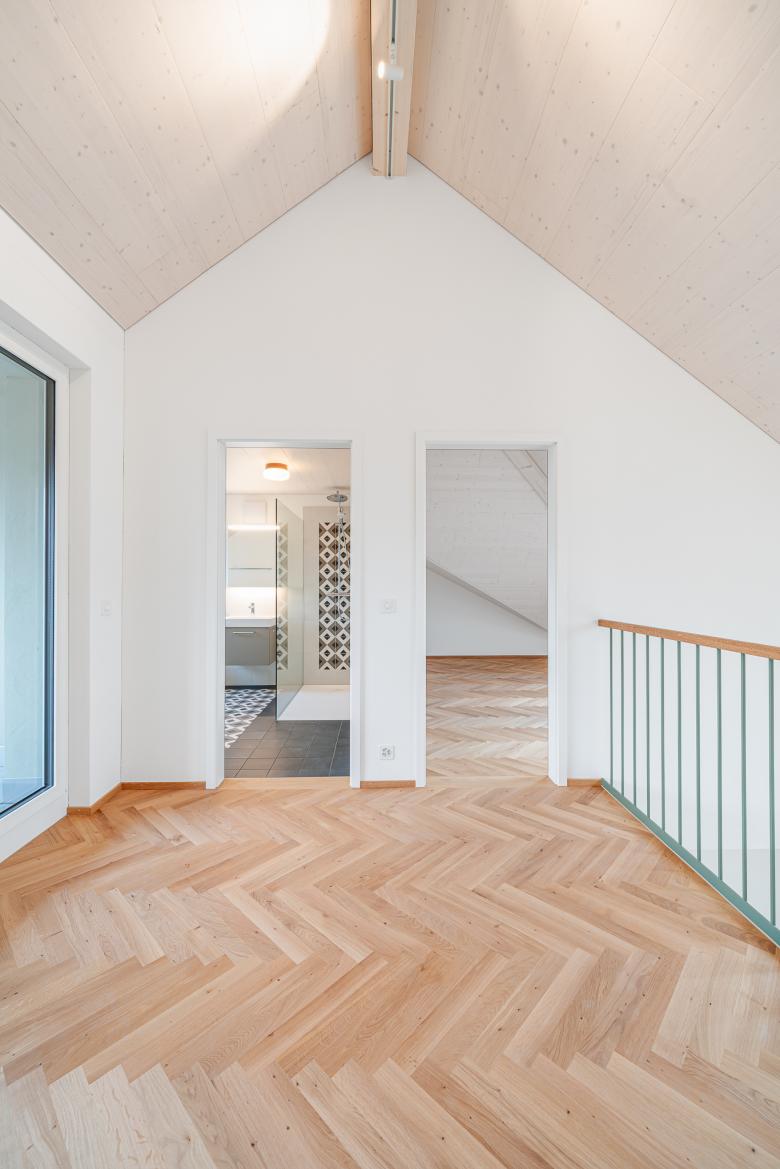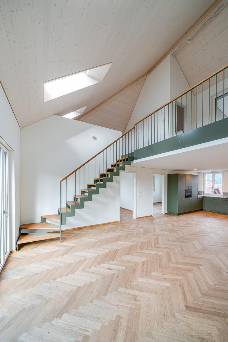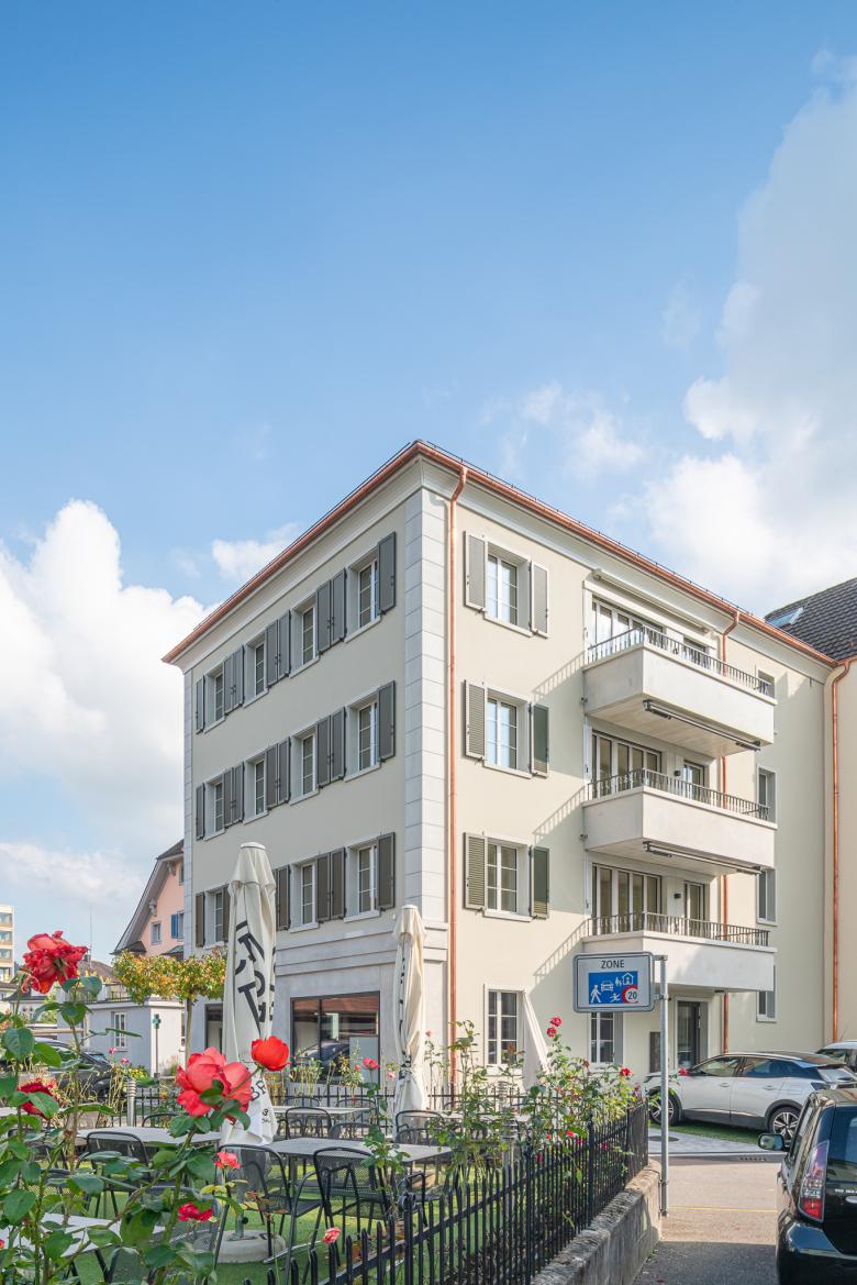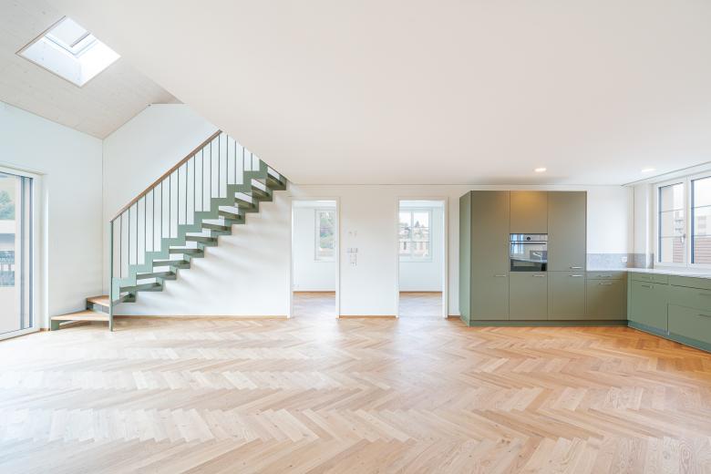 Im Erdgeschoss blieb die Gewerbenutzung erhalten. Sie trägt zum repräsentativen Charakter bei. Im 1. und 2. Obergeschoss ist je eine 4.5 Zimmer Wohnung eingebaut. Das 3. Obergeschoss sowie das Dachgeschoss sind zu einer 5.5 Zimmer Maisonette zusammengeschlossen. Die Grundrisse berücksichtigen in einem hohen Mass den Strassenlärm. Die Wohnräume sind so konzipiert, dass sie eine der Strasse abgewandte Seite besitzen. Der Hauptwohnraum ist als Durchwohnen ausgebildet und bildet das zentrale Element der Wohnung.