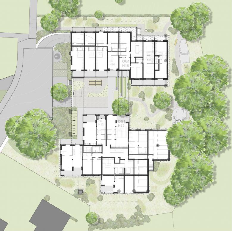 Zwei Neubauten liegen in einer gut durchgrünten Wohnumgebung mit einem über die Parzellengrenzen hinweg fliessenden Freiraum. Eine Föhrengruppe im Westen und das waldartige Gehölz im Osten, sind ein selbstverständlicher Teil der unmittelbaren Umgebung.