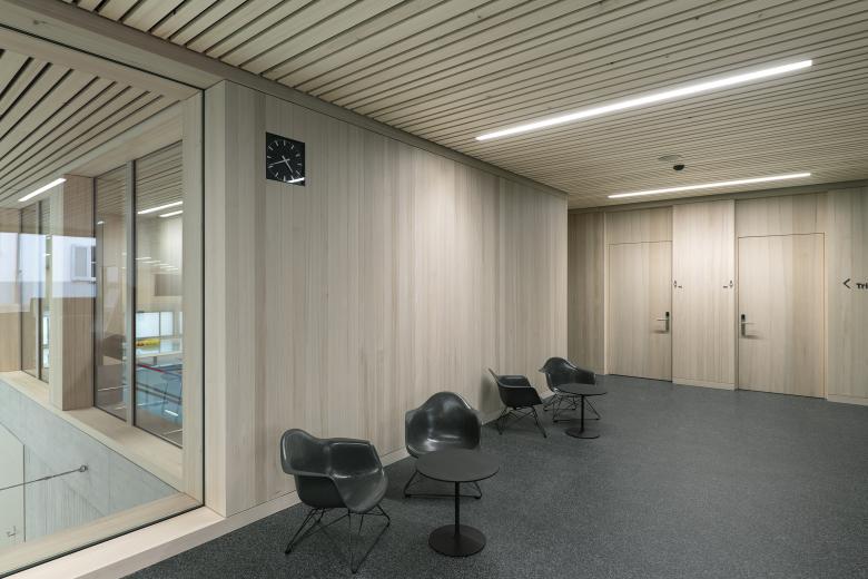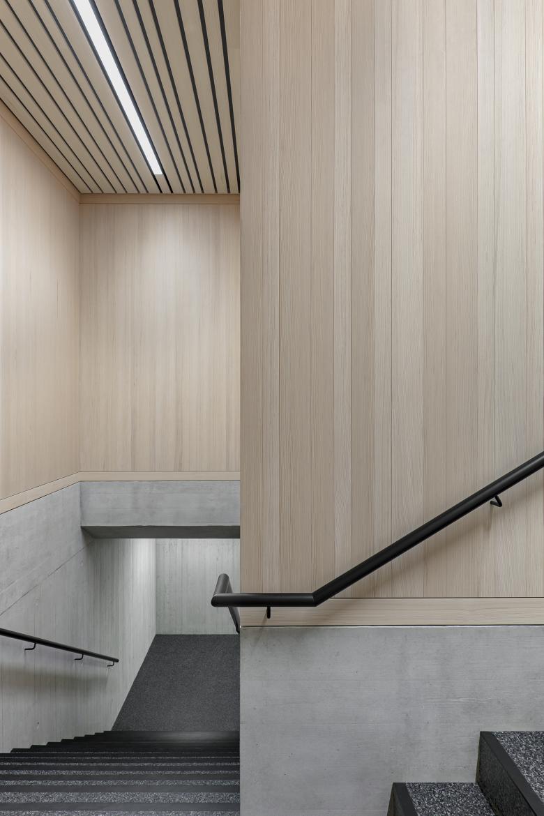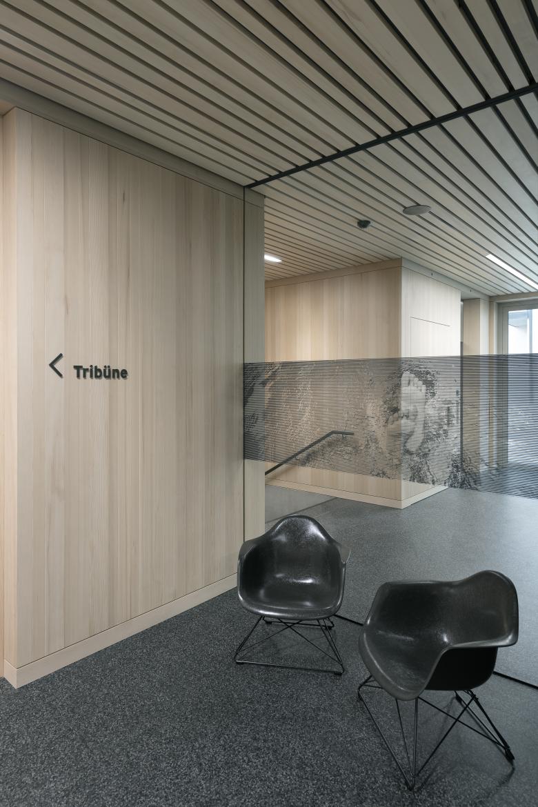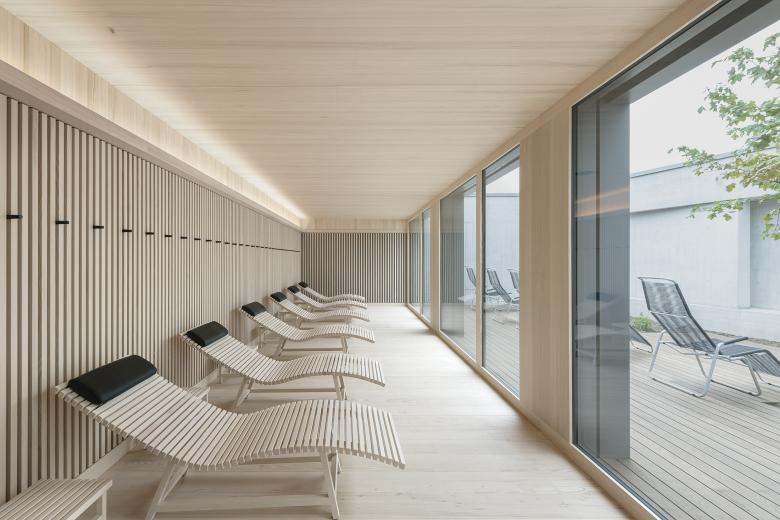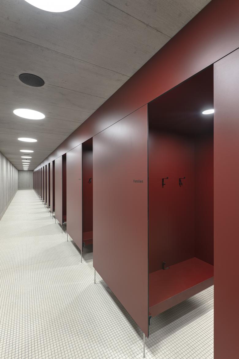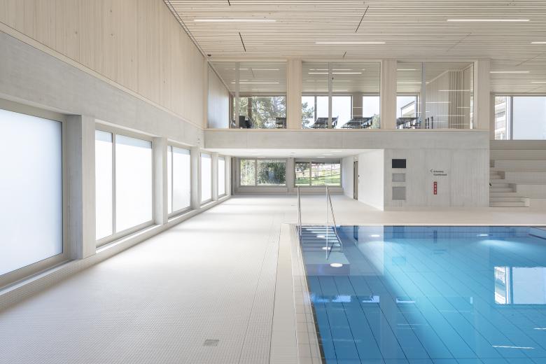 Die Inneraumgestaltung der Schwimmhalle spielt mit den Parametern "hart" und "weich"; im Nassbereich bilden die Sichtbetonwände zusammen mit den hellen Mosaikböden ein robustes, beständiges und rutschfestes Untergeschoss. Das OG ohne Spritzwasserkontakt wurde als weiches Gegenstück in Fichte Vollholz ausgeführt. Grosse Fensterflächen versorgen die Schwimmhalle mit Tageslicht. Im Wellnessbereich sind die Material-Gegensätzen noch grösser; die fensterlose Zone mit Saunen, Wärmestein, Kneippstationen und Duschen ist dunkel gefliest, wogegen der taghelle Ruheraum in Vollholz in starkem Kontrast steht.