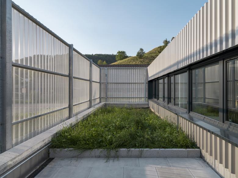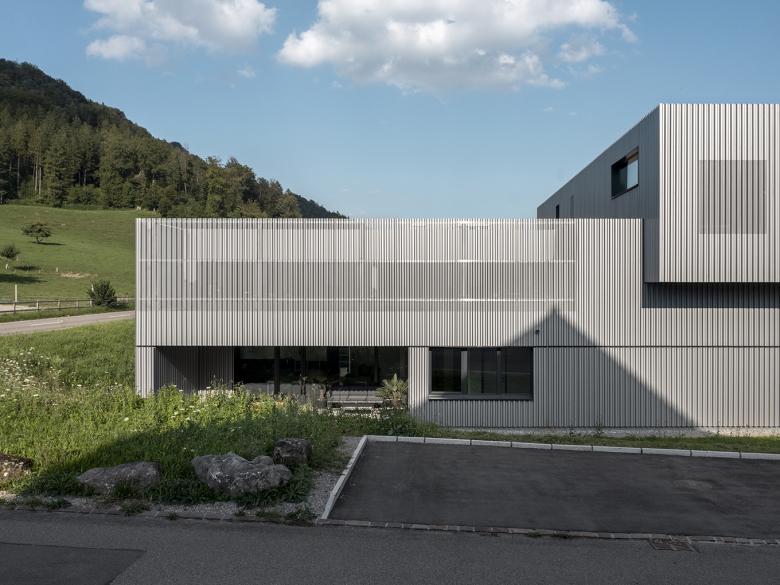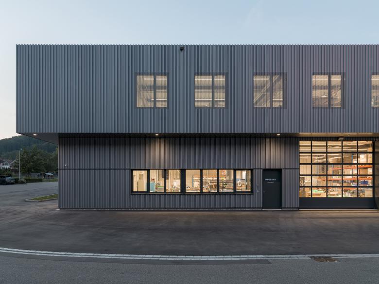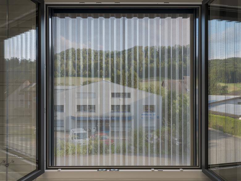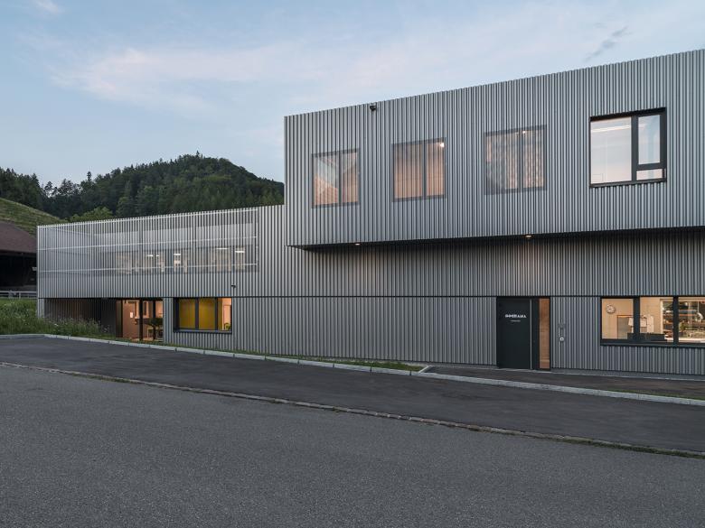 Aussen wurde dies mit einer einheitlichen Fassadenverkleidung aus lackiertem Trapezblech erreicht. Zudem bietet die teilweise gelochte Fassade, je nach Tageszeit und Witterung, interessante Ein- und Ausblicke und dient sogleich als Beschattung.