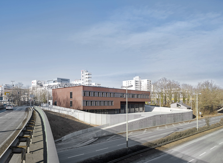 Das neue Grundstück liegt in unmittelbarer Nachbarschaft zum alten Standort am Rand der Nordweststadt. Es stellte die Architekten vor eine echte Herausforderung. Zwei Fahrzeughallen für fünf Feuerwehr- und drei Rettungsdienstfahrzeuge sowie den dazugehörigen Dienst- und Ruheräumen sollten auf dem engen Grünraumstreifen zwischen mehrspurigen Straßen untergebracht werden. Das vorgesehene komplexe Raumprogramm konnte nur auf dem kleinen Grundstück unterbracht werden, weil sich der Entwurf die Topographie des Ortes mit etwa sechs Metern Höhenunterschied zunutze machte.