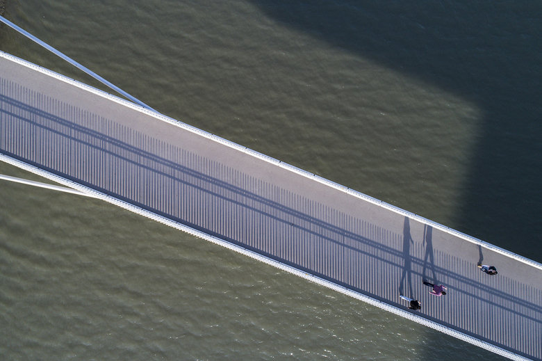 Nevertheless, the straight strings would discourage the human flow under bridge even though the headroom is within acceptable range. We were still looking for a way to really turn the structure into space. At last, we placed a tie rod at the middle point of the string to slightly pull it up, in order to make the whole construction more welcoming. In doing so, the footbridge becomes more integrated and powerful. Intricate in thinking, the structure of the footbridge appears to be effortless. It really converts the architecture into a comfortable urban place above water.