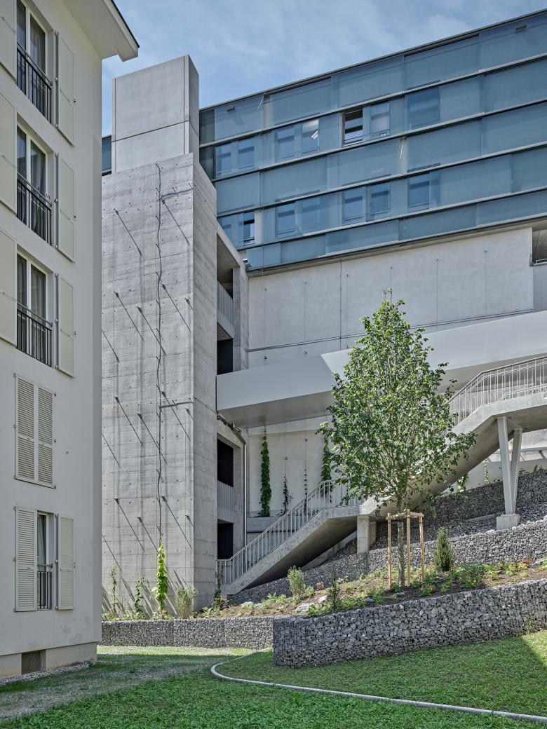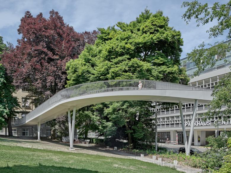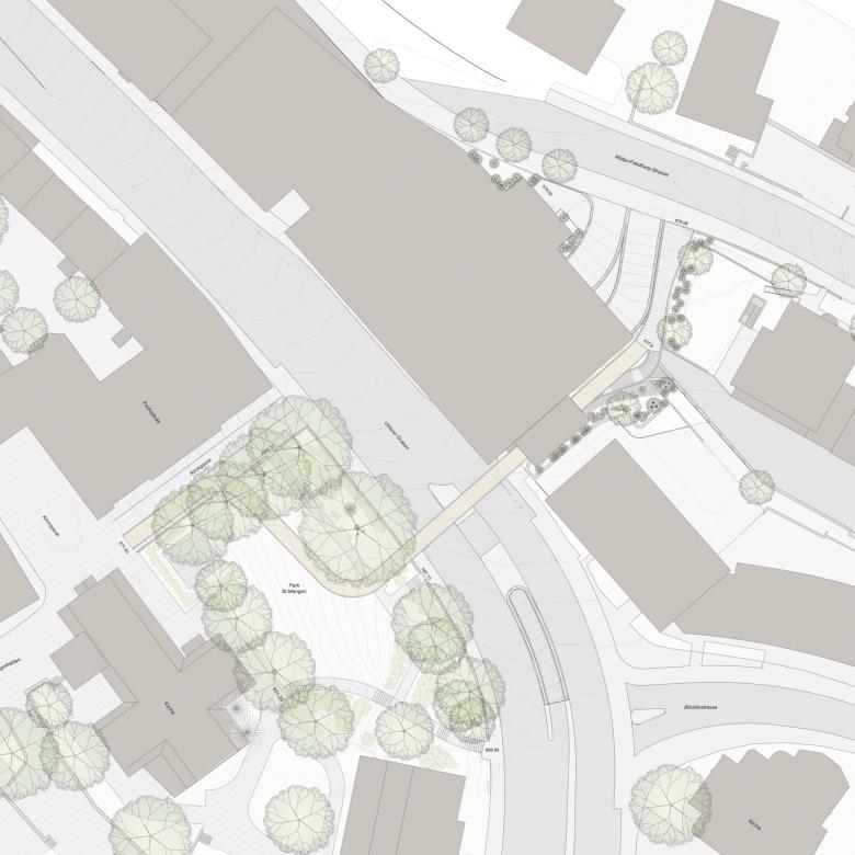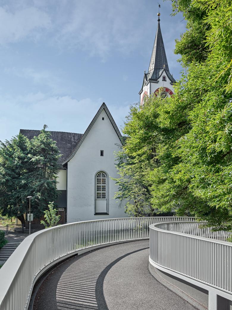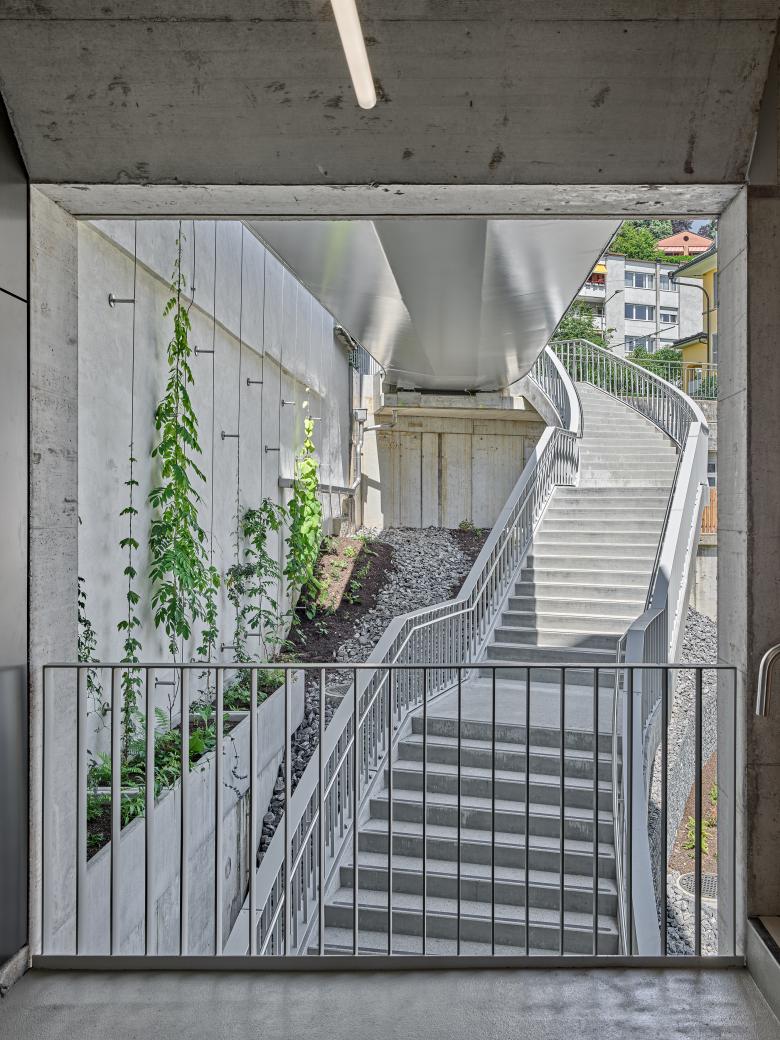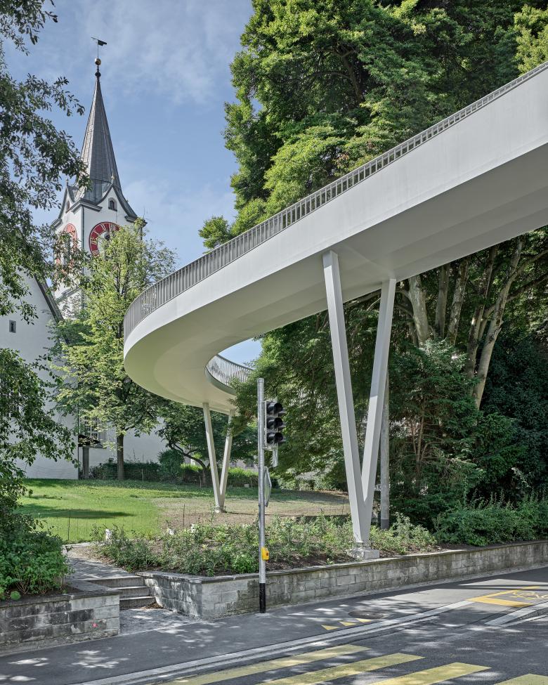 Der erhöhte hindernisfreie Weg wird zu einer landschaftlichen Promenade durch räumliche Sequenzen mit unterschiedlichen Charakteren: Stadtquartier, Park, Ausfahrtsstrasse, Parkhausgebäude und Wohnquartier. Durch den Erhalt der Bäume im Park und die Hinzufügung von Fassadenbegrünung, Bepflanzung und Kleinstrukturen trägt dieses Projekt zur Biodiversität mitten in der Stadt bei. Die grossen bestehenden Bäume und neuen Grünstrukturen spenden Schatten und Kühlung in der Hitze, und die vielen wasserdurchlässigen Flächen in der Umgebung der Brücke sorgen für eine gute Versickerung des Regenwassers. Die Passerelle wurde im März 2025 eröffnet. Basler & Hofmann, Nau2 und DGJ Paysages haben Kunstbau, Architektur und Landschaft integral als Generalplaner-Team entworfen.